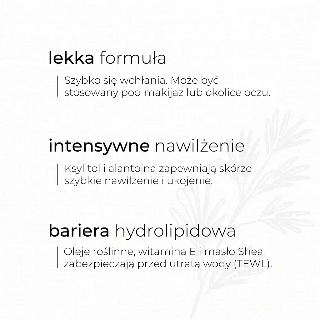 Produkt został stworzony z myślą o codziennej pielęgnacji każdego typu cery. Jego delikatna formuła jest szczególnie korzystna dla skóry suchej, odwodnionej, wrażliwej i atopowej. Składniki kremu zostały starannie dobrane, aby dostarczyć skórze odpowiedniego nawilżenia, łagodzić podrażnienia i chronić skórę przed szkodliwymi czynnikami zewnętrznymi.