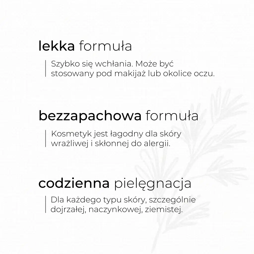 Unikalna formuła kremu została stworzona z myślą o każdym typie cery, zwłaszcza dojrzałej, naczynkowej, a także o tej o szarym i ziemistym kolorycie. Jego lekka formuła sprawdzi się jako baza pod makijaż oraz na delikatną skórę wokół oczu.
