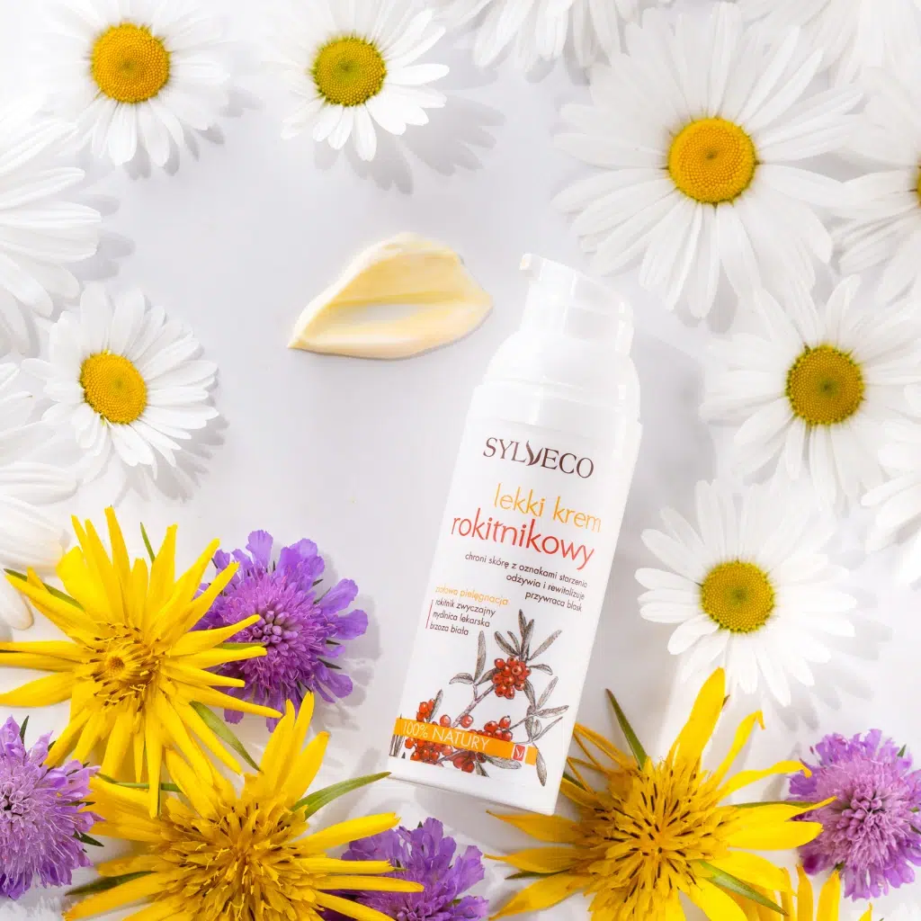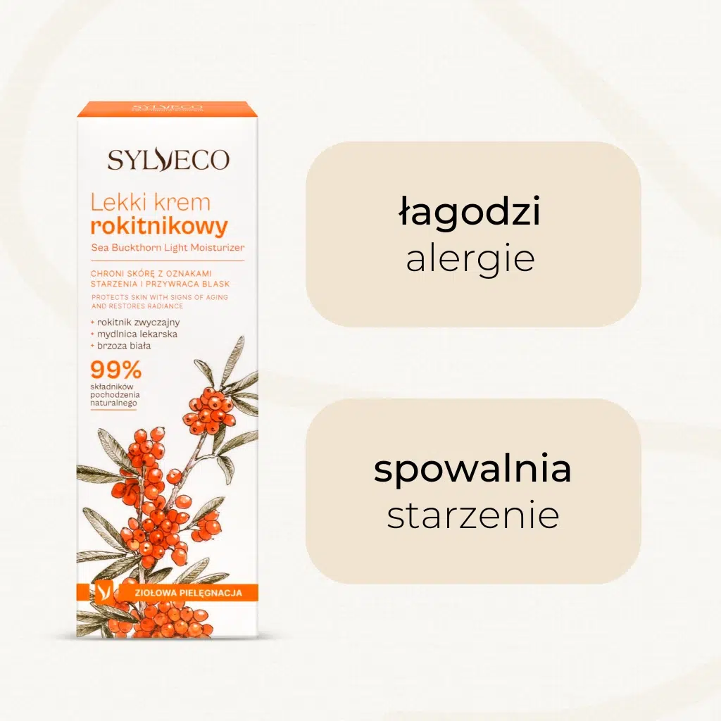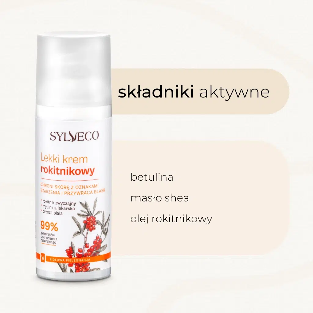 Naturalny lekki krem rokitnikowy jest przeznaczony do codziennej pielęgnacji każdego rodzaju cery i zapewnia ochronę skóry z oznakami starzenia. Zawiera bogaty w witaminy i mikroelementy olej rokitnikowy, o wyjątkowym działaniu odżywczym, rewitalizującym i wzmacniającym. Ekstrakt z kory brzozy, dzięki właściwości pobudzania syntezy kolagenu i elastyny, skutecznie opóźnia proces powstawania zmarszczek. Naturalne oleje roślinne i masło karite odbudowują warstwę wodno-lipidową i w połączeniu z alantoiną zapewniają skórze szybkie ukojenie. Ekstrakt z aloesu przywraca właściwy poziom nawilżenia, natomiast dodatek witaminy E zabezpiecza skórę przed negatywnym wpływem środowiska. Ekstrakt z mydlnicy lekarskiej, zawierający saponiny, ułatwia wnikanie składników aktywnych głębiej do skóry. Krem może być stosowany pod makijaż oraz na okolice przemęczonych oczu.