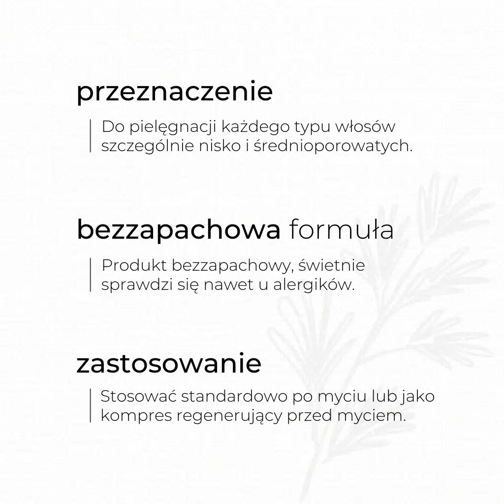 Produkt sprawdzi się w pielęgnacji każdego rodzaju włosów, szczególnie nisko i średnioporowatych. Maskę możesz stosować standardowo po myciu włosów, ale również jako kompres regenerujący przed myciem.