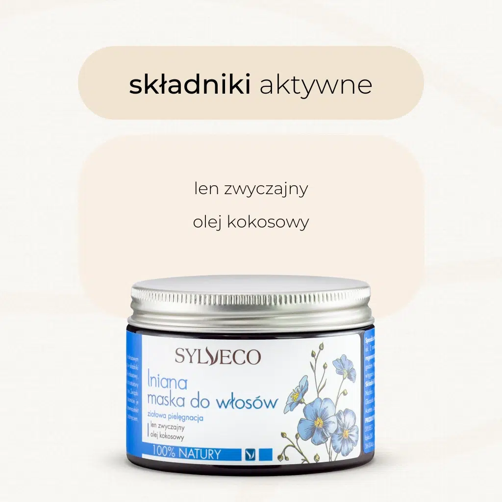 Naturalna maska do włosów z ekstraktem z nasion lnu zwyczajnego i olejem kokosowym przeznaczona jest do pielęgnacji włosów suchych i łamliwych. Jest bogata w składniki nawilżające i odżywcze, pozwala poprawić wygląd i kondycję włosów. Olej kokosowy, dzięki swoim wyjątkowym właściwościom, wykazuje zdolność przenikania do struktury włosa, zwiększa nawilżenie końcówek, zapobiega także ich rozdwajaniu się. Związki śluzowe, zawarte w nasionach lnu, powlekają i chronią włosy, znakomicie je wygładzając. Nałożenie maski po umyciu ułatwia rozczesanie włosów, zapewnia efekt miękkich, lekkich i lśniących kosmyków. Stosowanie maski jako kompresu, przed myciem, zdecydowanie poprawia nawilżenie i zwiększa elastyczność włosów.