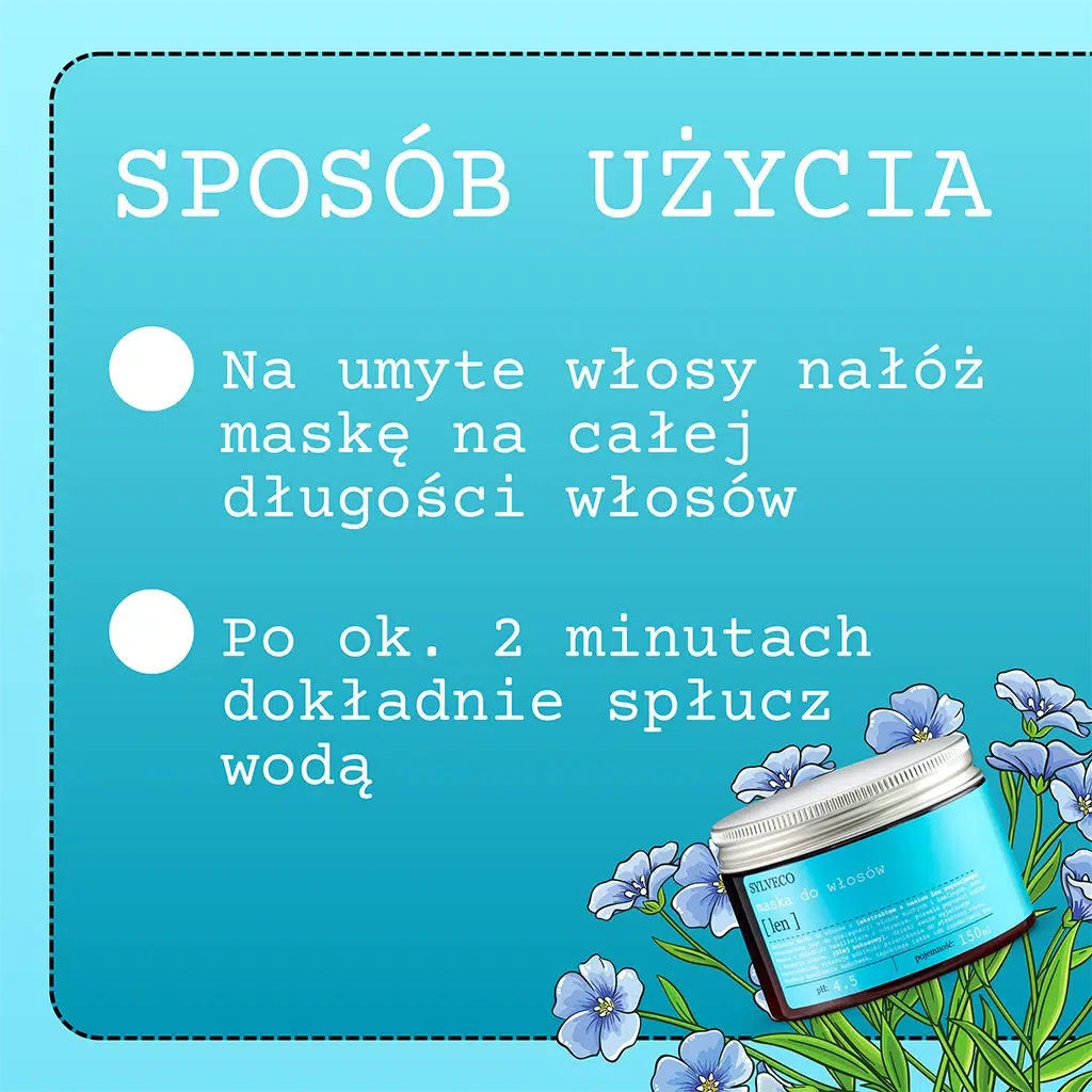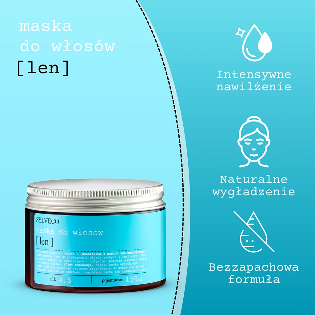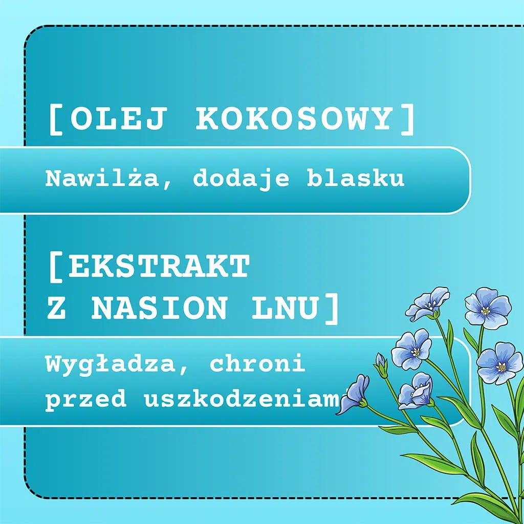 Naturalna maska do włosów z [ekstraktem z nasion lnu zwyczajnego], przeznaczona jest do pielęgnacji włosów suchych i łamliwych. Jest bogata w składniki nawilżające i odżywcze, pozwala poprawić wygląd i kondycję włosów. [Olej kokosowy], dzięki swoim wyjątkowym właściwościom, wykazuje zdolność przenikania do struktury włosa, zwiększa nawilżenie końcówek, zapobiega także ich rozdwajaniu się.