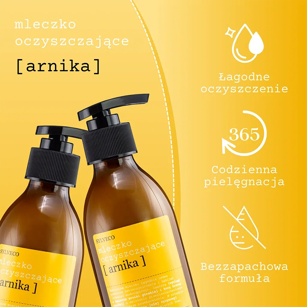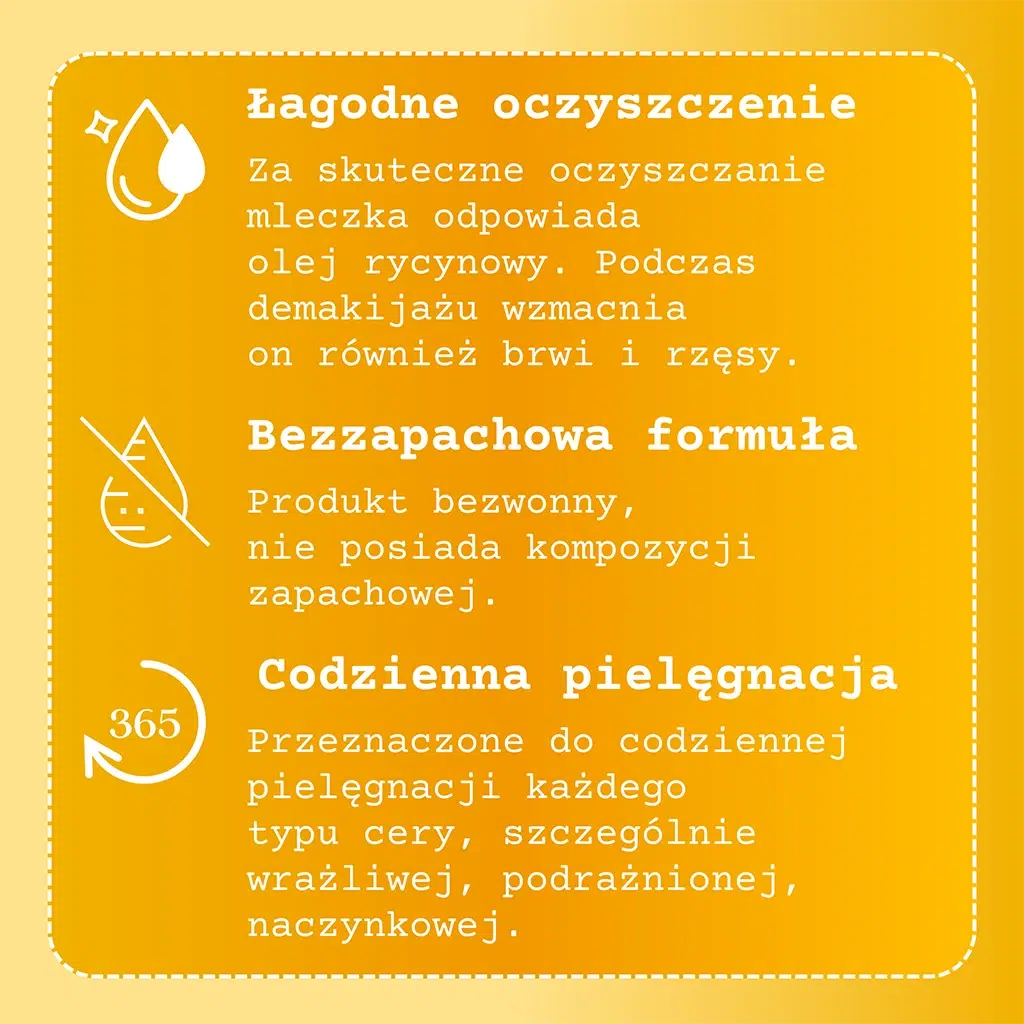 Naturalne mleczko łagodnie usuwa wszelkie zanieczyszczenia i makijaż (również wodoodporny). Zawiera [wyciągi z kwiatów arniki górskiej i kory brzozy białej] o działaniu przeciwstarzeniowym i redukującym przebarwienia. W składzie znajduje się także [olej rycynowy] o właściwościach wzmacniających brwi i rzęsy.