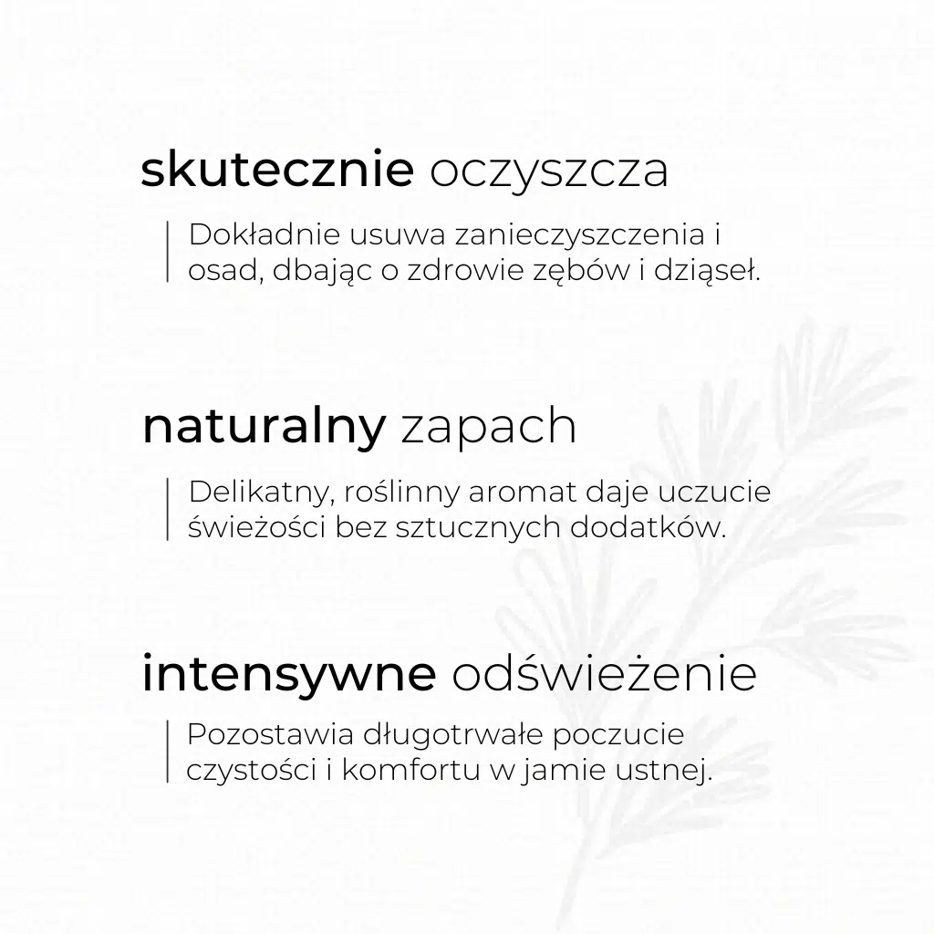 Naturalna pasta, przeznaczona do codziennego mycia zębów u dorosłych i dzieci. Nie zawiera fluoru ani jego pochodnych. Jest bogata w ekstrakty ziołowe (szałwia, mięta, rozmaryn, goździki), ksylitol, który zapobiega próchnicy i łagodzącą alantoinę. Dokładnie i bezpiecznie oczyszcza dzięki niskocząsteczkowym składnikom ścierającym, a olejki eteryczne z mięty pieprzowej i eukaliptusa mocno odświeżają oddech.