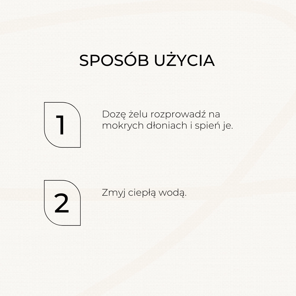 | Sposób użycia | Dozę żelu rozprowadzić na mokrych dłoniach, spienić i zmyć ciepłą wodą. Po każdym myciu zaleca się aplikację odpowiedniego kremu do rąk. |