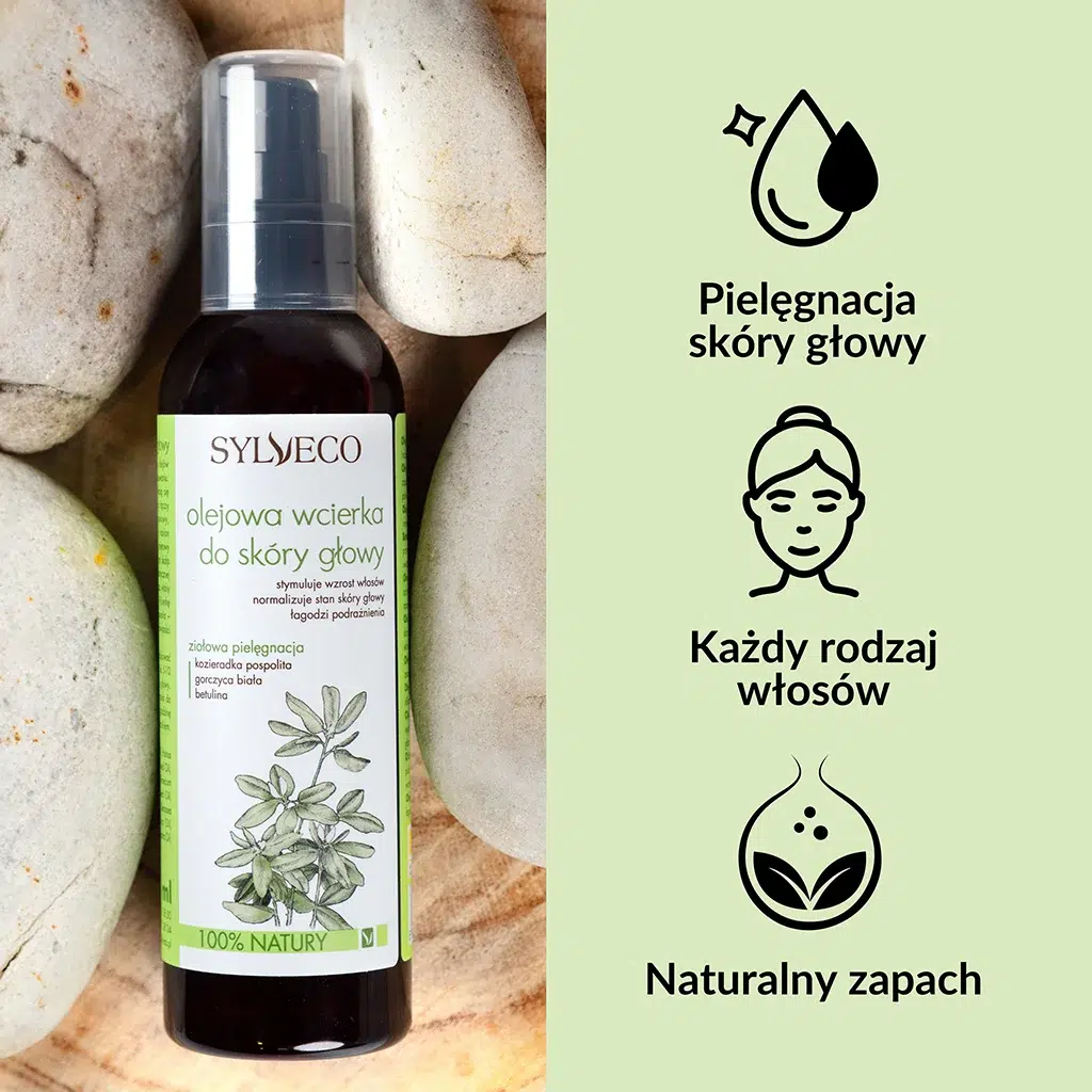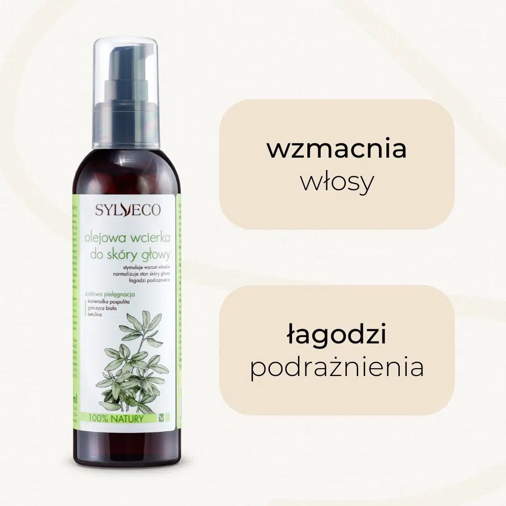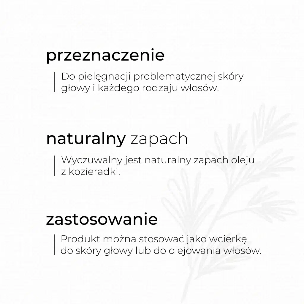 Specjalnie skomponowana mieszanka olejów roślinnych do wcierania o szerokim zastosowaniu. Powstała z myślą o osobach, które borykają się z problemami skóry głowy. Wcierka łączy stymulujące wzrost włosów oleje (rycynowy, laurowy, z kozieradki, musztardowy, z nasion czarnuszki) oraz olejki eteryczne (pichtowy, miętowy i rozmarynowy) o działaniu normalizującym skalp i wzmacniającym cebulki. Dzięki systematycznej aplikacji, skóra głowy mniej się przetłuszcza, włosy rosną szybciej, zagęszczając fryzurę. Wcierkę można także stosować do zabiegu olejowania – sprawdzi się przy każdym typie i stopniu porowatości włosów.