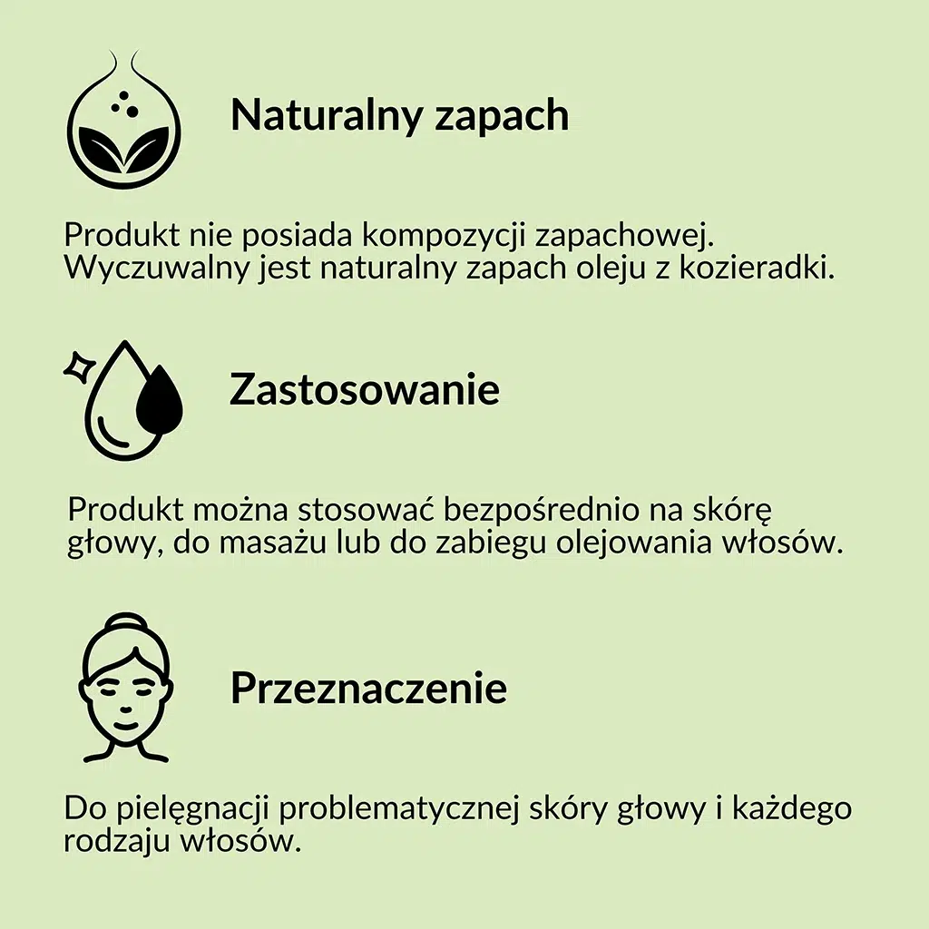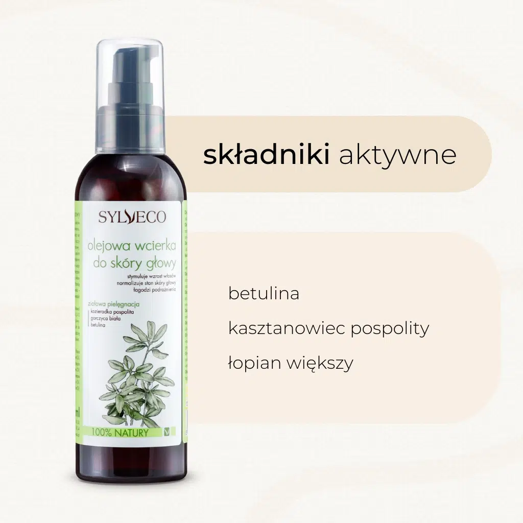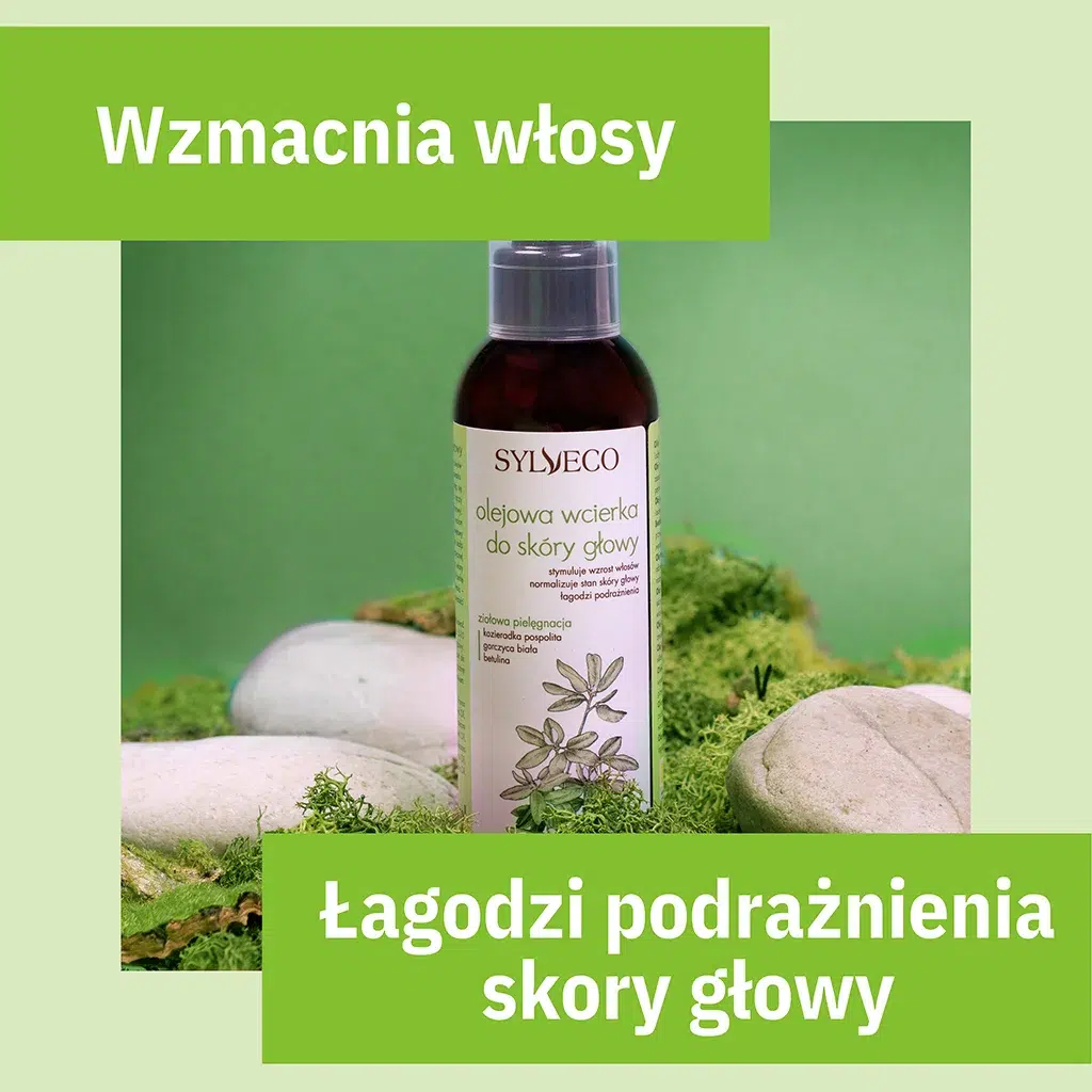 Specjalnie skomponowana mieszanka olejów roślinnych do wcierania o szerokim zastosowaniu. Powstała z myślą o osobach, które borykają się z problemami skóry głowy. Wcierka łączy stymulujące wzrost włosów oleje (rycynowy, laurowy, z kozieradki, musztardowy, z nasion czarnuszki) oraz olejki eteryczne (pichtowy, miętowy i rozmarynowy) o działaniu normalizującym skalp i wzmacniającym cebulki. Dzięki systematycznej aplikacji, skóra głowy mniej się przetłuszcza, włosy rosną szybciej, zagęszczając fryzurę. Wcierkę można także stosować do zabiegu olejowania – sprawdzi się przy każdym typie i stopniu porowatości włosów.