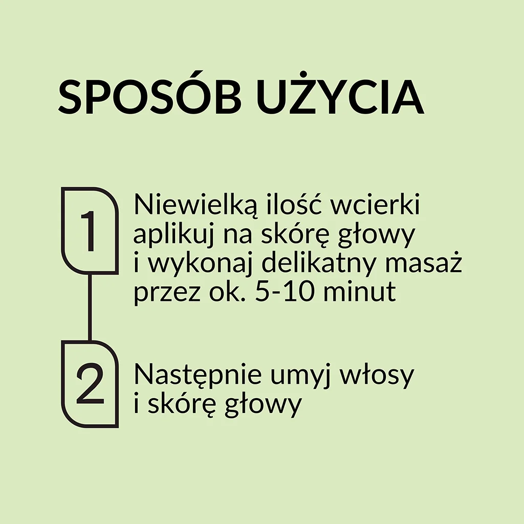 Sposób użycia: niewielką ilość wcierki aplikować na skórę głowy i wykonać delikatny masaż (ok. 5-10 minut). Następnie umyć włosy i skórę głowy. Stosować 2-3 razy w tygodniu. Jako produkt do olejowania najlepiej nałożyć na minimum godzinę lub na całą noc, owijając włosy ręcznikiem. Następnie umyć włosy.