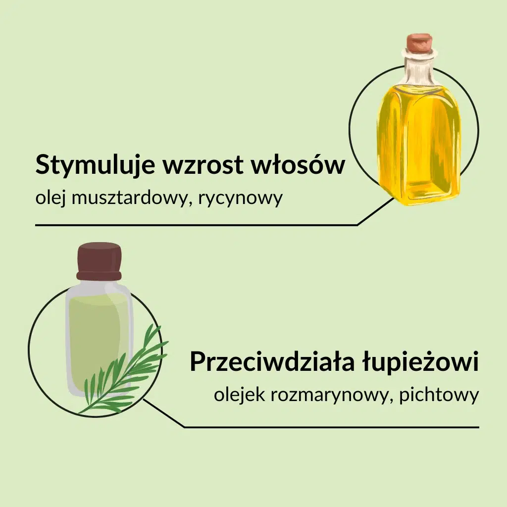 Stymulujące wzrost włosów oleje, takie jak rycynowy, laurowy, z kozieradki, musztardowy oraz z nasion czarnuszki, sprawiają, że włosy odzyskują blask, stają się zdrowsze i mocniejsze. Wcierka wzmacnia cebulki włosów, poprawia mikrokrążenie skóry głowy i przyspiesza wzrost włosów.