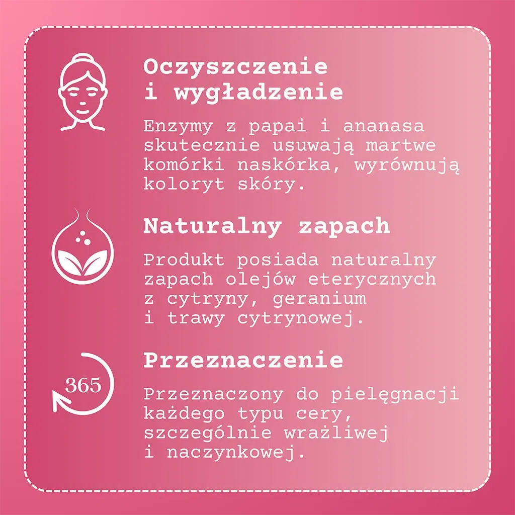 Delikatny peeling do twarzy zawierający enzymy z papai i ananasa. Skutecznie złuszcza zrogowaciały naskórek. Sprawdzi się w pielęgnacji każdego typu cery, szczególnie wrażliwej i naczynkowej. Polecany jest osobom, które nie tolerują peelingów mechanicznych lub kwasów, a ich skóra wymaga łagodnego oczyszczenia.