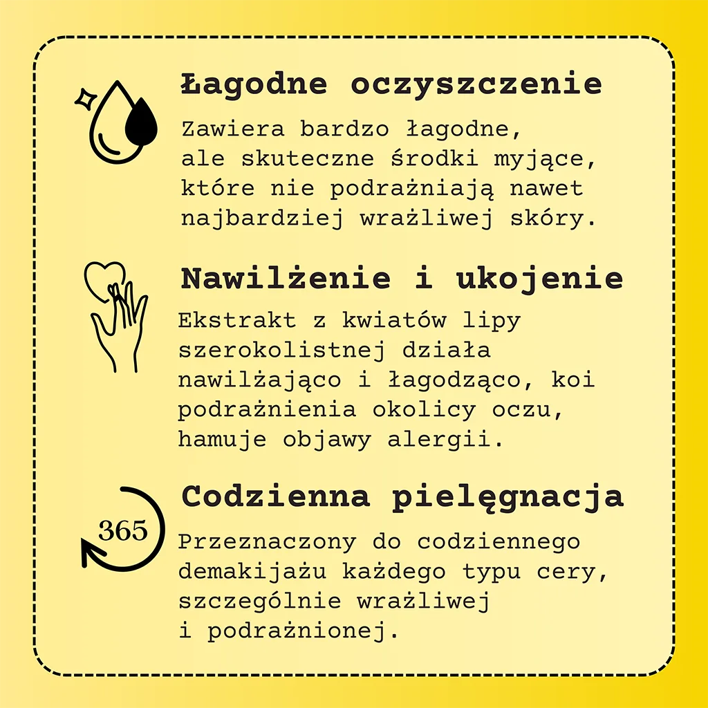 Zawiera [ekstrakt z kwiatów lipy szerokolistnej], który wykazuje działanie nawilżające i osłaniające, zwiększa elastyczność i sprężystość oraz odporność skóry na utratę wody. Delikatny składnik myjący pozwala łatwo usunąć nawet intensywny i wodoodporny makijaż.