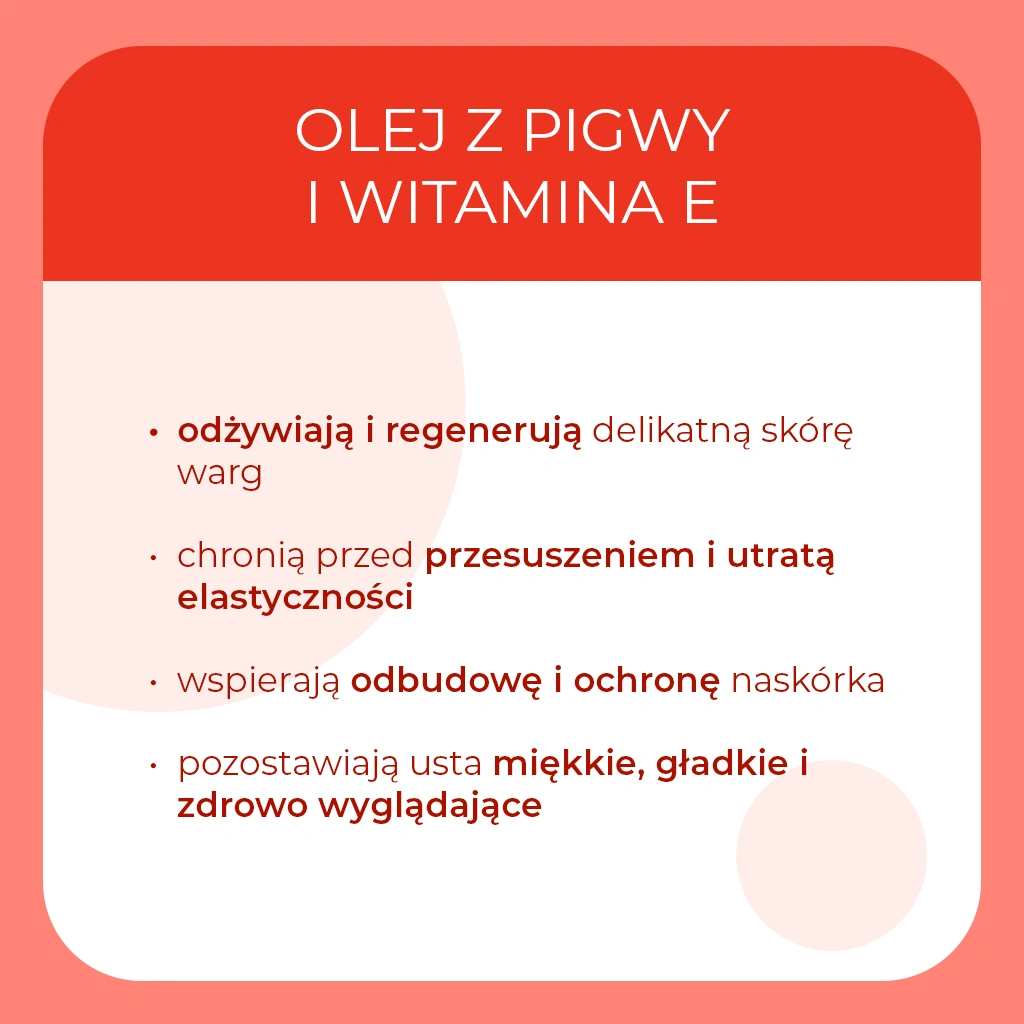 Bogata kompozycja olejów roślinnych, w tym oleju arganowego oraz oleju z nasion pigwowca, intensywnie odżywia i wspiera regenerację skóry ust. Składniki te poprawiają elastyczność i pomagają odbudować naturalną barierę ochronną. Regularne stosowanie sprawia, że usta są mniej podatne na pękanie i przesuszenie. To pielęgnacja, która realnie poprawia kondycję ust z dnia na dzień.