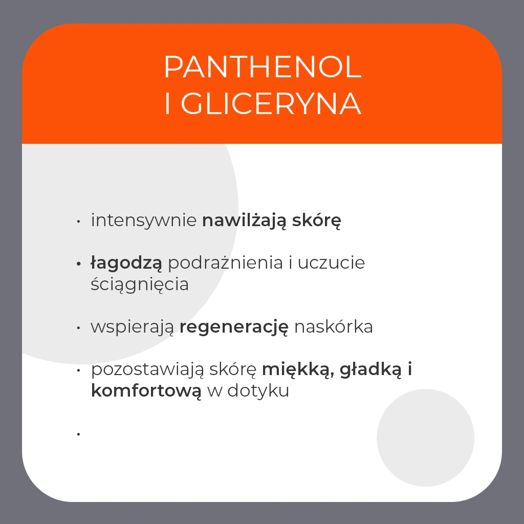 Panthenol i alantoina działają kojąco, pomagając złagodzić podrażnienia i wspierając regenerację skóry. Składniki te przynoszą ulgę szczególnie po goleniu, treningu lub długim kontakcie z czynnikami drażniącymi. Skóra staje się spokojniejsza, bardziej elastyczna i odporna na dyskomfort. Regularne stosowanie sprzyja utrzymaniu dobrej kondycji skóry.