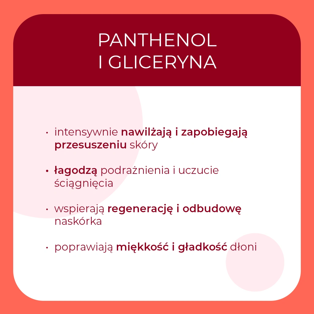 Zawarta w formule gliceryna pomaga zatrzymać wilgoć w skórze, chroniąc ją przed wysuszeniem. Dłonie po użyciu mydła są wyraźnie bardziej miękkie i elastyczne. Panthenol dodatkowo wspiera regenerację naskórka i poprawia komfort skóry. Regularne stosowanie sprawia, że dłonie wyglądają na zadbane i zdrowe.