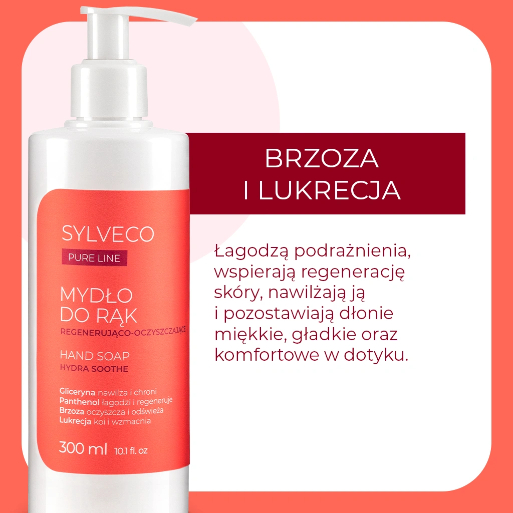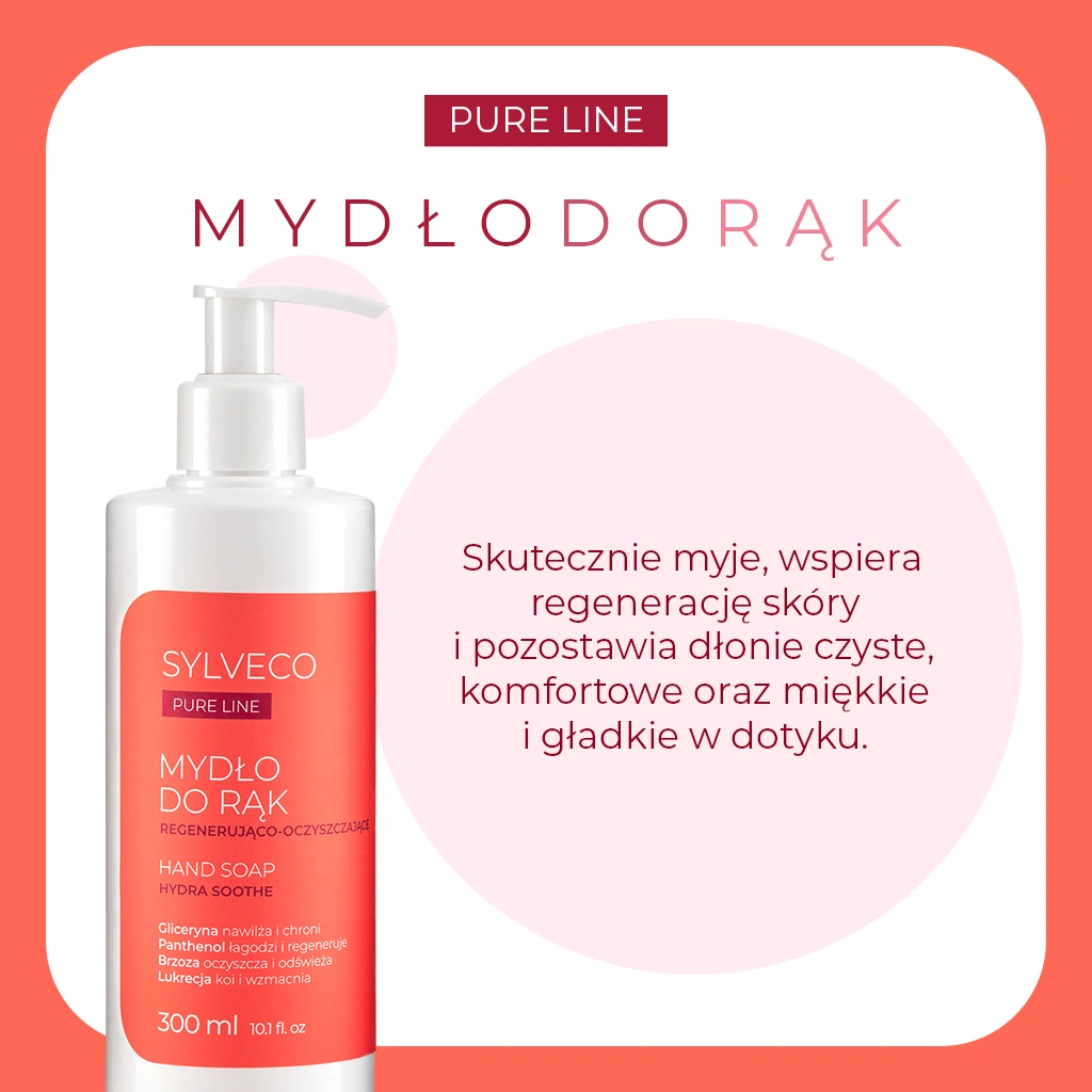Regenerująco-oczyszczające mydło do rąk SYLVECO PURE LINE zostało stworzone z myślą o pielęgnacji dłoni narażonych na częste mycie. Łagodne substancje myjące skutecznie usuwają zanieczyszczenia, nie powodując przesuszenia. Pantenol i gliceryna dbają o nawilżenie, a ekstrakty z brzozy, robinii i lukrecji wspierają regenerację i łagodzą podrażnienia. Formuła z alantoiną dodatkowo chroni skórę przed dyskomfortem. Subtelny zapach dopełnia przyjemność codziennej pielęgnacji