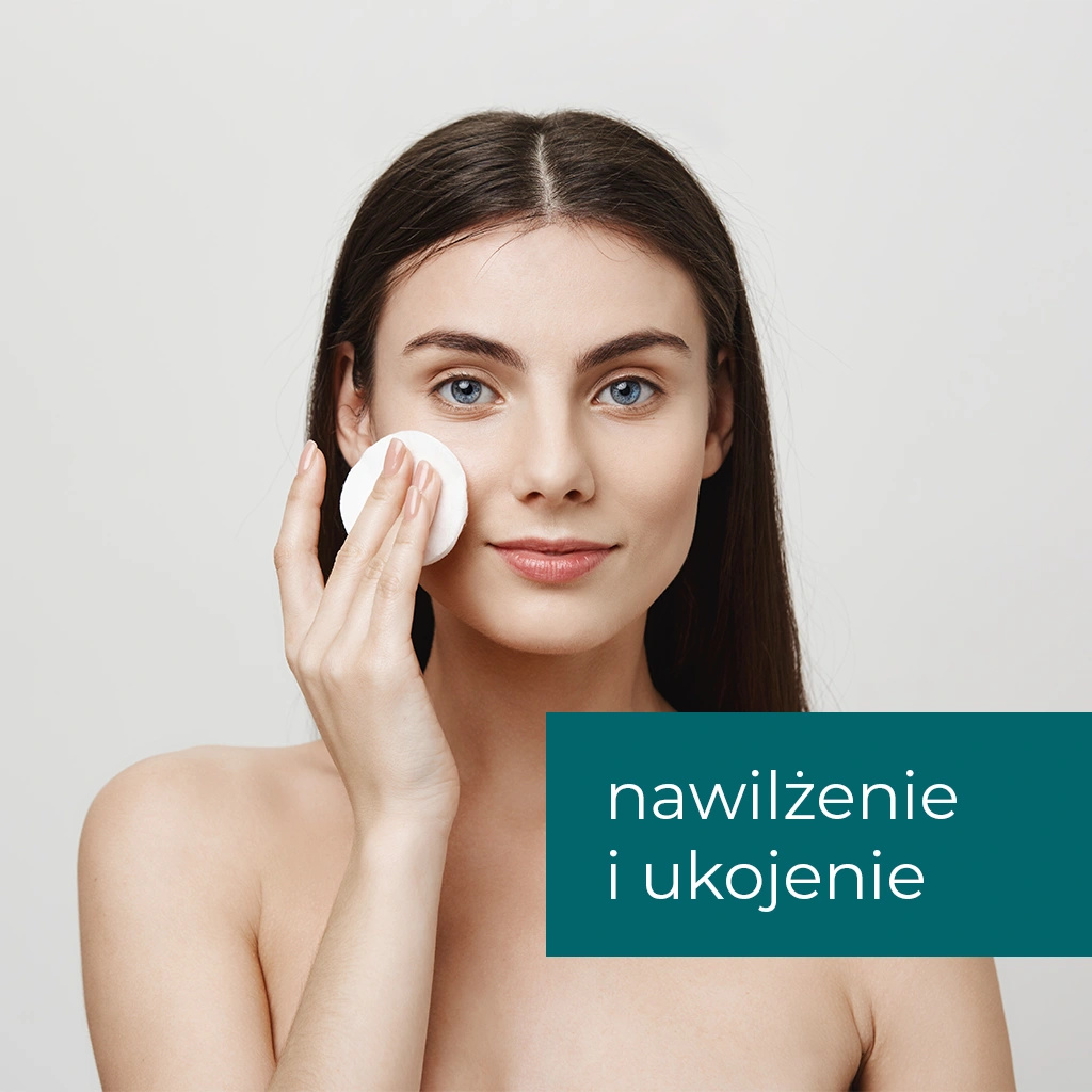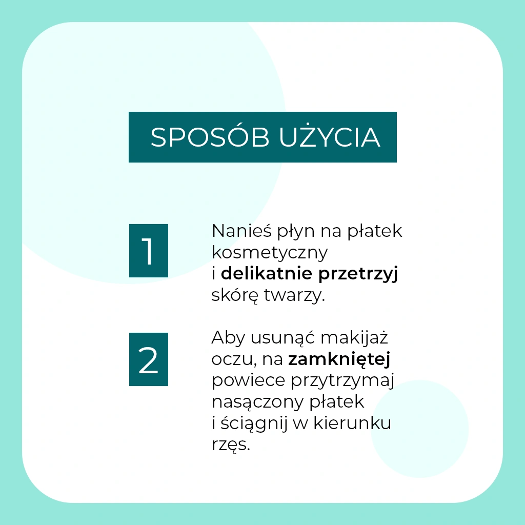 Nanieś płyn na płatek kosmetyczny i delikatnie przetrzyj skórę twarzy, szyi i dekoltu. Aby usunąć makijaż oczu, na zamkniętej powiece przytrzymaj nasączony płatek i ściągnij w kierunku rzęs.