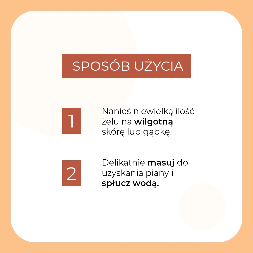 Nanieś niewielką ilość żelu na wilgotną skórę lub gąbkę, delikatnie masuj do uzyskania piany, a następnie dokładnie spłucz wodą