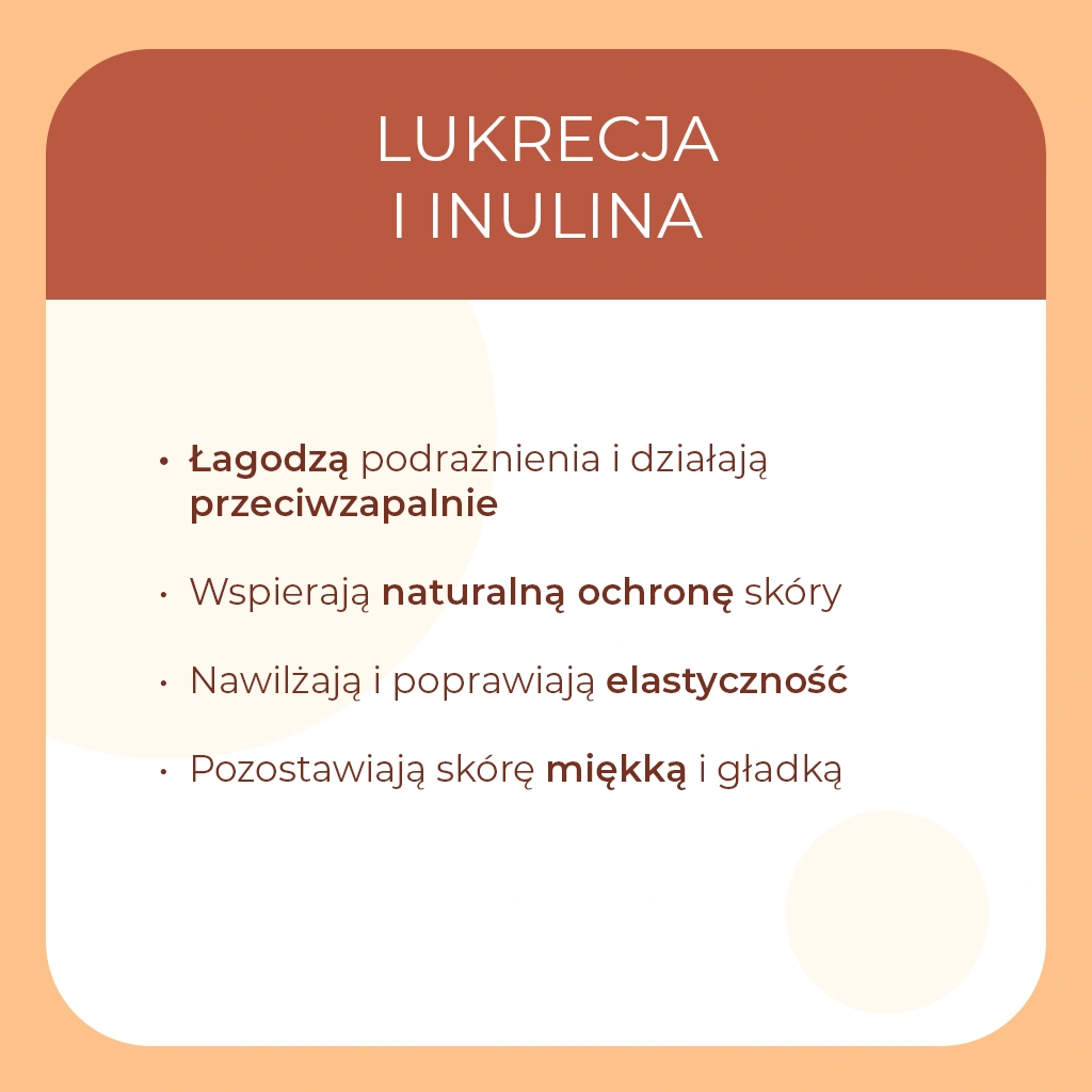 Ten żel pod prysznic łączy skuteczne oczyszczanie z łagodną pielęgnacją, dzięki zastosowaniu łagodnych detergentów i składników aktywnych. Pantenol, gliceryna i inulina dbają o odpowiedni poziom nawilżenia, a ekstrakty z owsa, nagietka i lukrecji koją podrażnienia i wspierają regenerację skóry. Olejek ze skórki pomarańczy nadaje produktowi orzeźwiający, naturalny zapach, który poprawia nastrój. Formuła jest odpowiednia do codziennego stosowania, także dla skóry wrażliwej. To idealny wybór dla osób ceniących naturalną pielęgnację i świeżość.