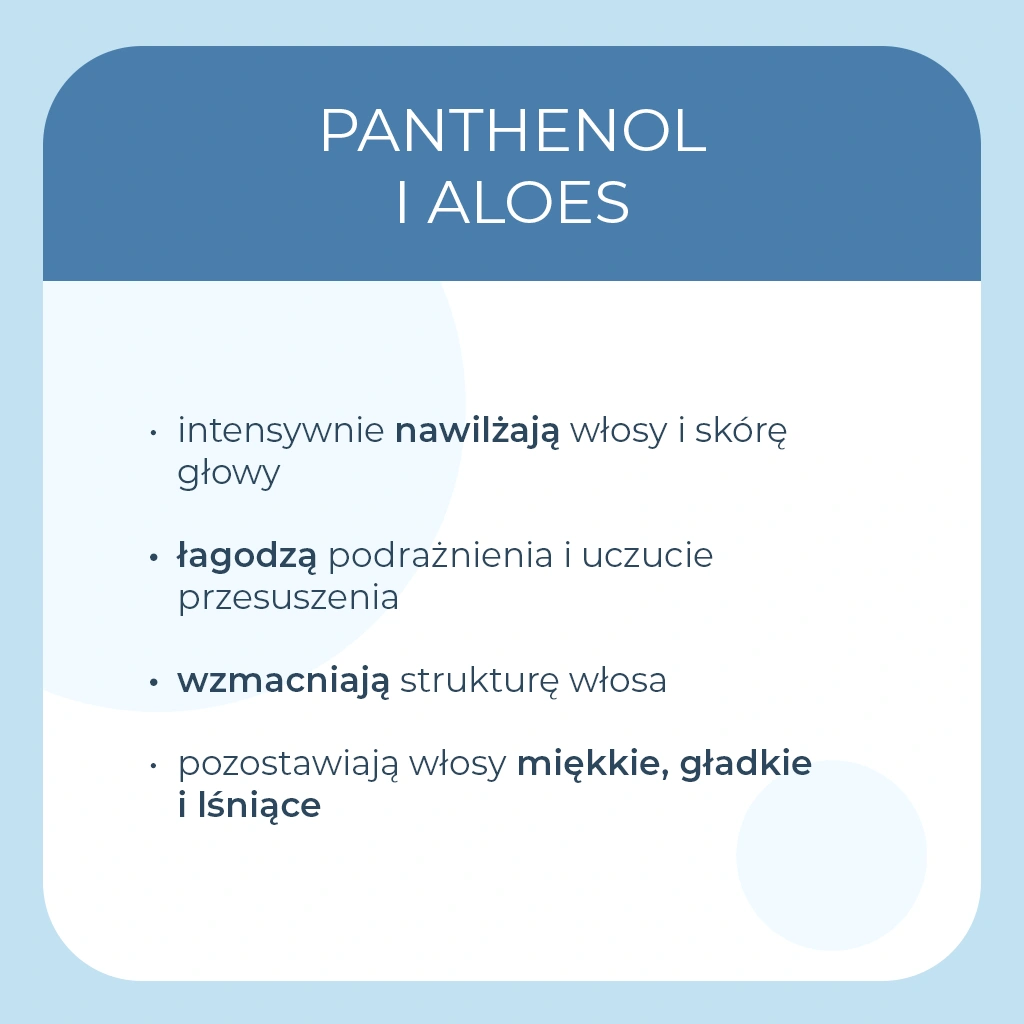 Aloes oraz panthenol działają kojąco i regenerująco, wspierając zarówno włosy, jak i skórę głowy. Pomagają zmniejszyć uczucie suchości i dyskomfortu, poprawiając komfort codziennej pielęgnacji. Włosy stają się bardziej sprężyste i mniej podatne na puszenie. To szczególnie ważne dla osób z wrażliwą skórą głowy lub włosami osłabionymi.