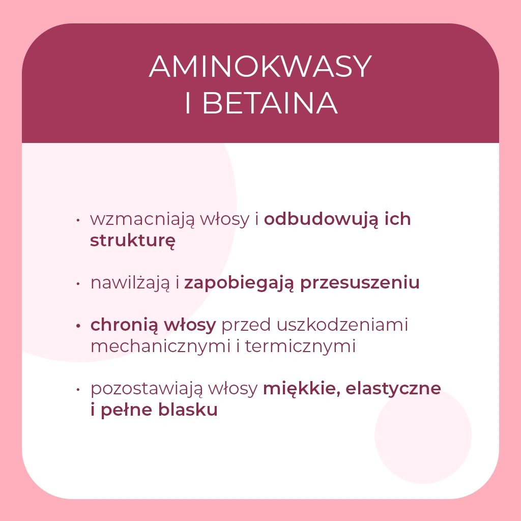 Kompleks aminokwasów pszenicy i soi wspiera odbudowę struktury włosa, uzupełniając mikrouszkodzenia powstałe w wyniku stylizacji czy czynników zewnętrznych. Panthenol dodatkowo wzmacnia włosy i wspiera ich regenerację na całej długości. Regularne stosowanie sprawia, że włosy stają się mocniejsze i bardziej odporne na uszkodzenia mechaniczne. To doskonałe rozwiązanie dla włosów osłabionych, suchych lub zniszczonych.