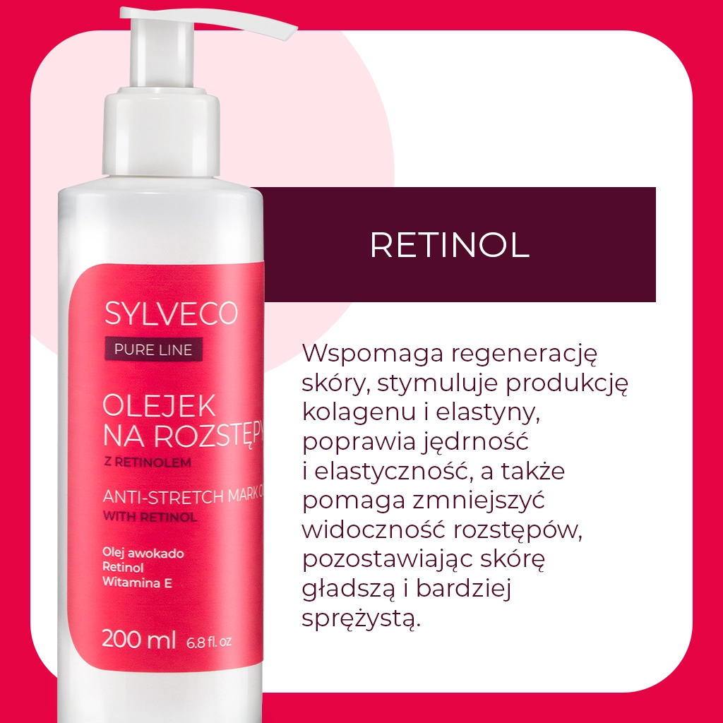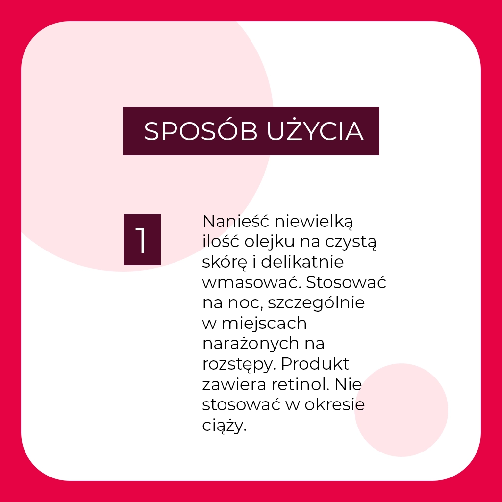 Zawarty w olejku retinol wspiera naturalne procesy odnowy skóry i pomaga poprawić jej strukturę. Skóra stopniowo staje się gładsza, bardziej jednolita i lepiej napięta. Olej z awokado oraz trójglicerydy kaprylowo-kaprynowe wzmacniają działanie regenerujące, dostarczając skórze cennych lipidów. Dzięki temu olejek działa nie tylko profilaktycznie, ale także pielęgnuje skórę z widocznymi rozstępami.