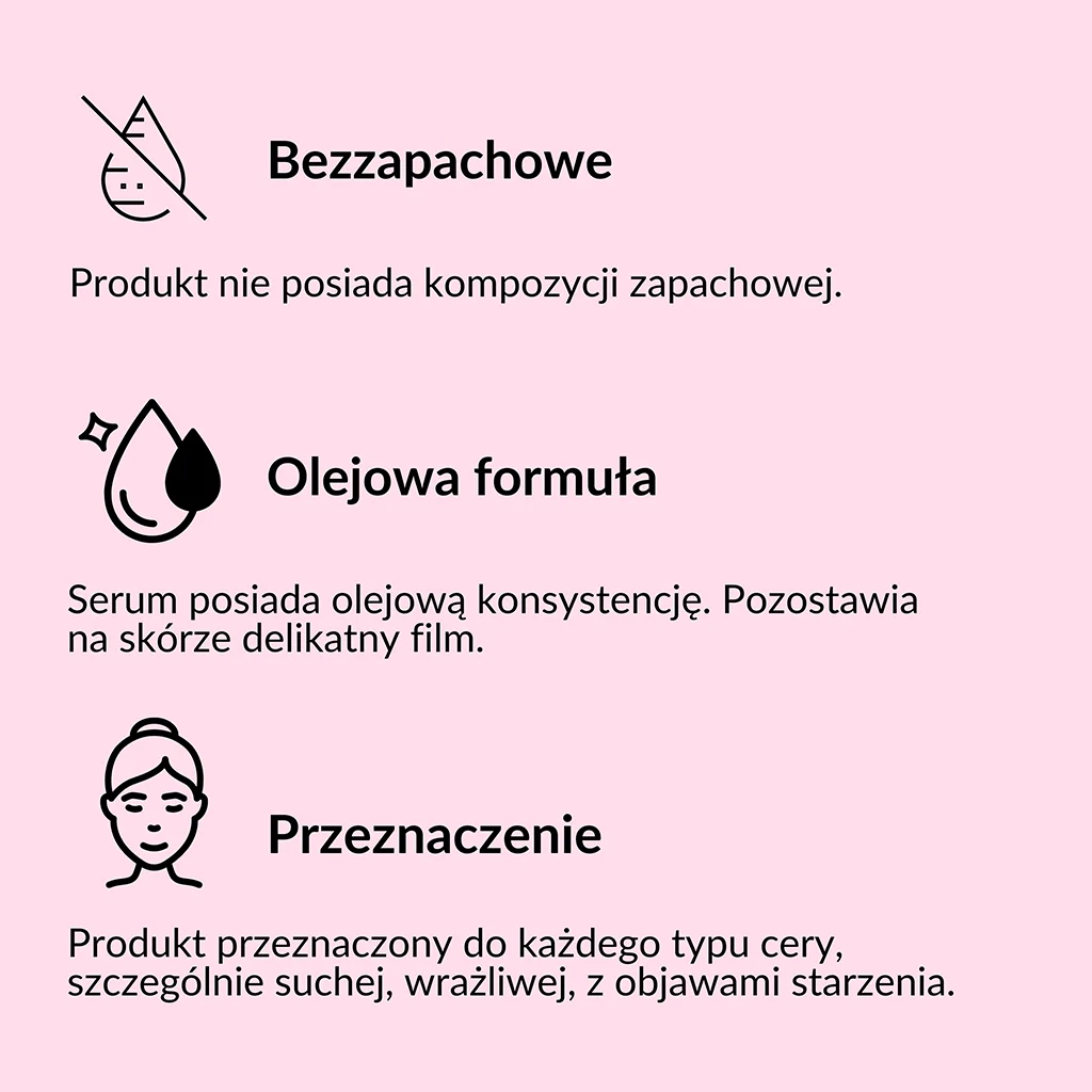 Serum posiada olejową konsystencję, która po aplikacji pozostawia na skórze delikatny film. Dzięki temu Twoja skóra zyskuje dodatkową ochronę przed szkodliwymi czynnikami zewnętrznymi i uszkodzeniami. Produkt sprawdza się szczególnie w wieczornej pielęgnacji.