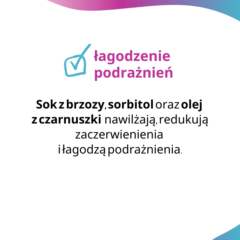 Sok z brzozy, sorbitol oraz olej z czarnuszki redukują zaczerwienienia, łagodzą podrażnienia i zapewniają skórze odpowiedni stopień nawilżenia. Rezultat? Skóra jest gładka i miękka w dotyku, gotowa na kolejne etapy pielęgnacji.