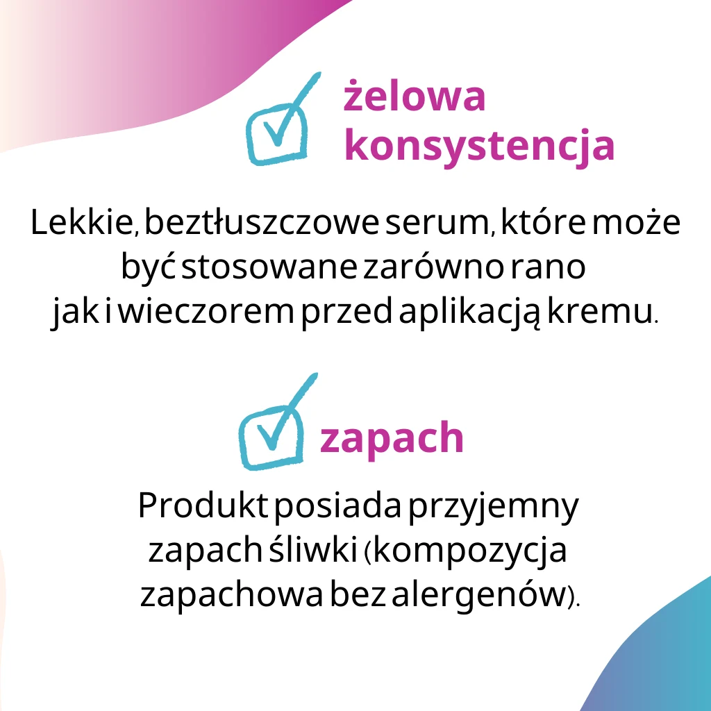 Serum ma lekką, beztłuszczową, żelową konsystencję. Możesz je stosować zarówno rano, jak i wieczorem przed aplikacją kremu. Kosmetyk nie obciąża skóry i nie pozostawia tłustego filmu. Posiada naturalny zapach śliwki, dzięki czemu codzienna pielęgnacja jest niezwykle przyjemna.