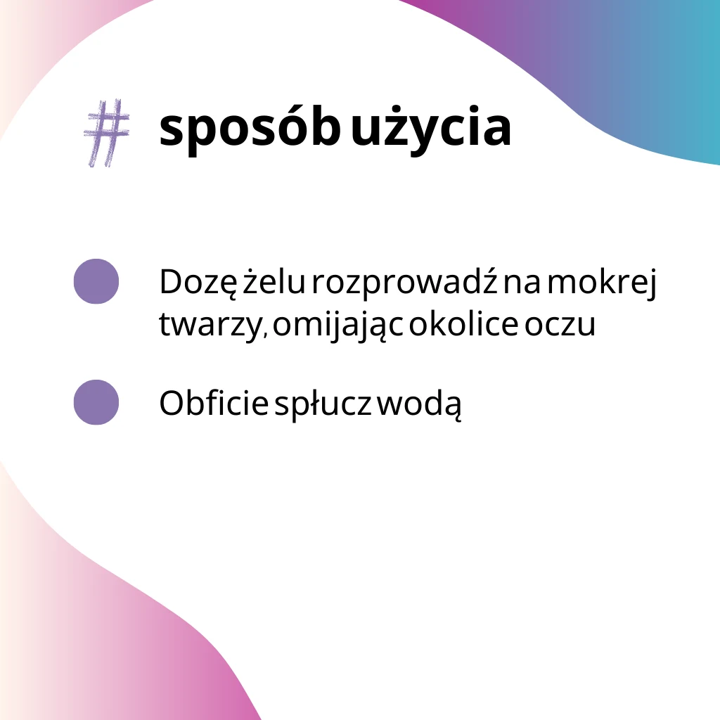 | Sposób użycia | Dozę żelu rozprowadzić na mokrej twarzy, omijając okolice oczu. Obficie spłukać wodą. Stonizować cerę za pomocą toniku, a następnie nałożyć krem. |
