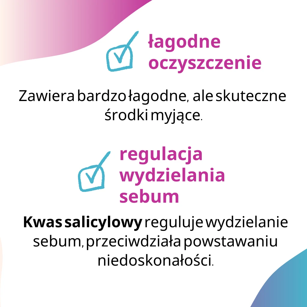 Żel do mycia twarzy, przeznaczony do oczyszczania cery tłustej, mieszanej i trądzikowej z pierwszymi problemami skórnymi. Pozostawia skórę wygładzoną, miękką i promienną. Delikatnie, ale skutecznie oczyszcza, reguluje wydzielanie sebum i przeciwdziała powstawaniu niedoskonałości.