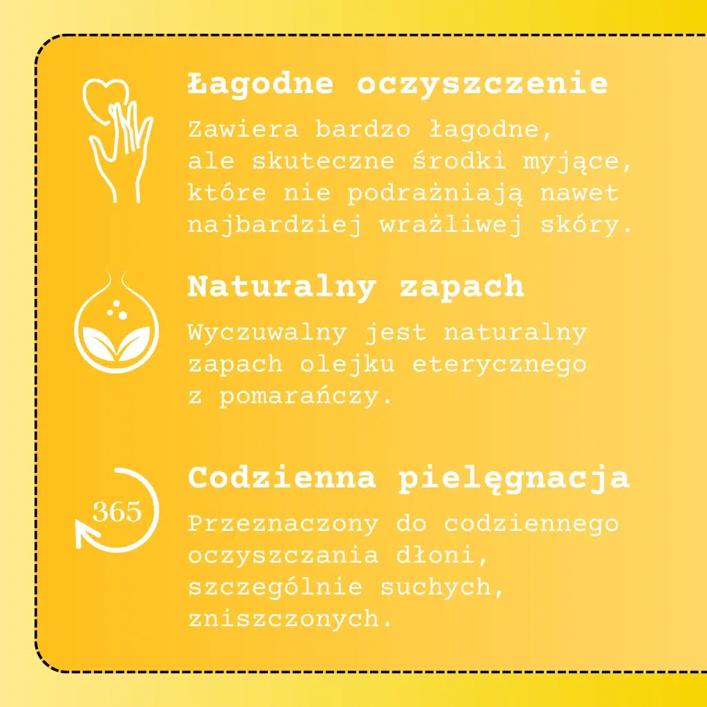 Łagodny, a przy tym pachnący pomarańczą, żel myjący, stworzony dla suchych, szorstkich lub zniszczonych skór dłoni. Może być stosowany także zapobiegawczo, podczas codziennego kontaktu z wodą. Zapomnij o suchej, podrażnionej skórze i ciesz się długotrwałym uczuciem komfortu.
