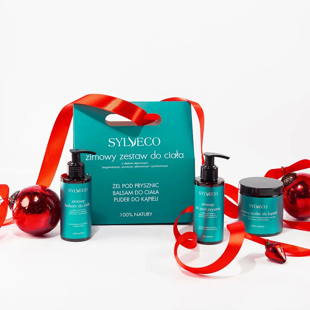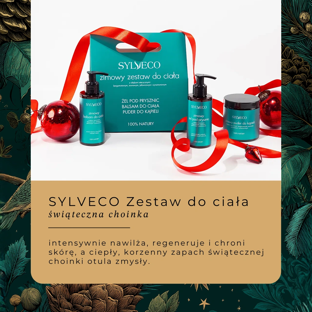 Zimowy zestaw SYLVECO o zapachu świątecznej choinki, to zaproszenie do świata zimowego relaksu i harmonii. Leśny, świąteczny zapach sosny, jałowca, bergamotki i cynamonu przenosi do serca magicznego, zimowego lasu i otula ciało oraz zmysły spokojem. To idealny prezent zarówno dla bliskiej osoby, jak i dla siebie, który pozwala zwolnić tempo i poczuć atmosferę zimowych chwil.