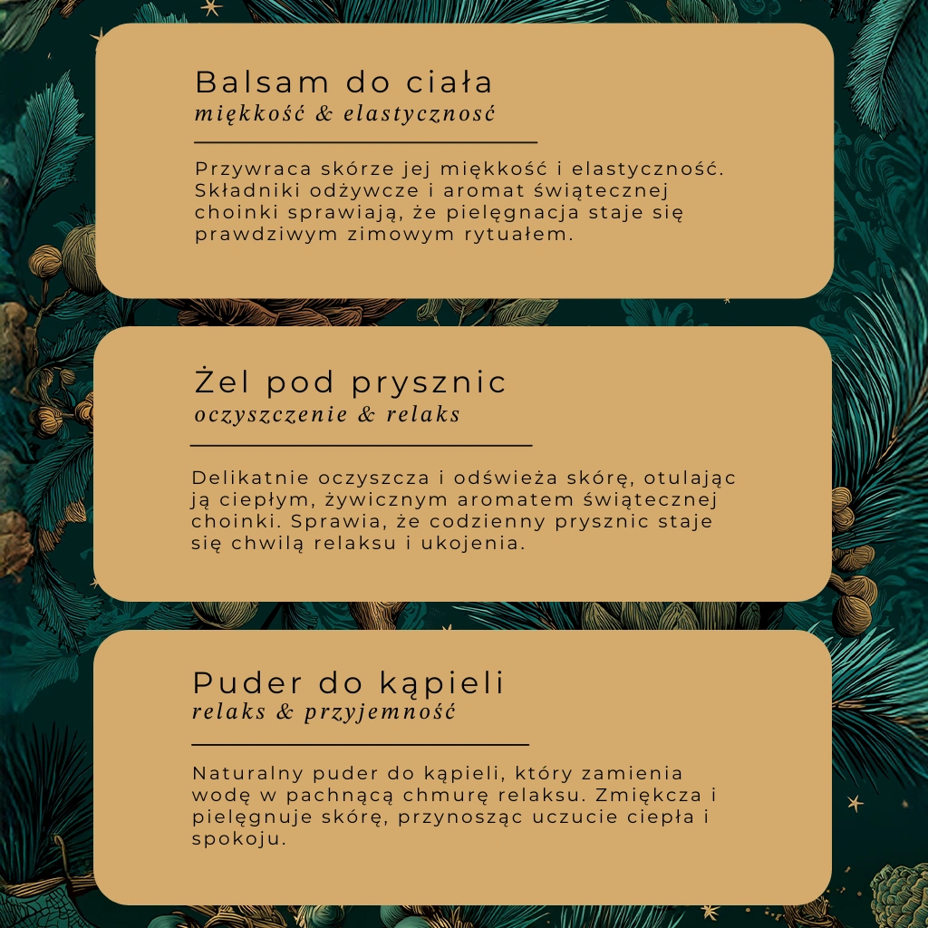 Trzy wyjątkowe produkty – żel pod prysznic, balsam do ciała i puder do kąpieli – tworzą pełny rytuał zimowej pielęgnacji. Żel delikatnie oczyszcza i odświeża, balsam intensywnie nawilża i chroni, a puder do kąpieli koi i relaksuje, dodając przyjemności i relaksu codziennej pielęgnacji.