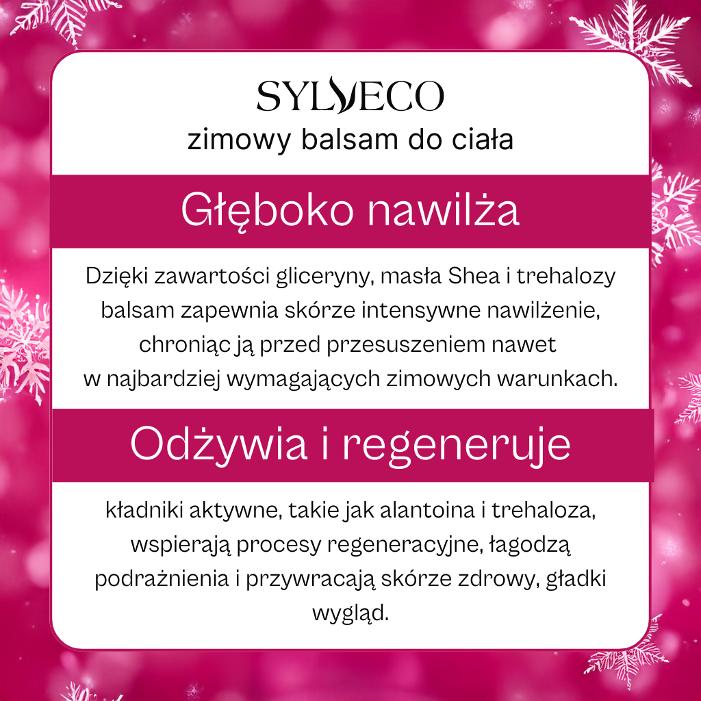 Balsam został opracowany z myślą o skórze narażonej na działanie niskich temperatur i suchego powietrza. Masło shea, gliceryna i oleje roślinne intensywnie nawilżają oraz zapobiegają utracie wody z naskórka. Skóra staje się wyraźnie bardziej miękka i elastyczna już po pierwszym użyciu. To solidna baza codziennej pielęgnacji w sezonie zimowym.