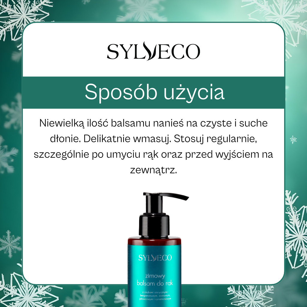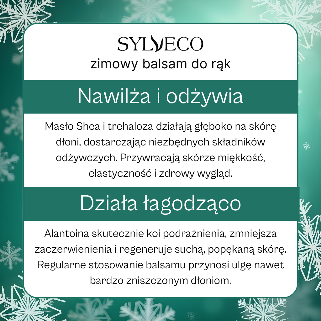 Odkryj nasz zimowy balsam do rąk, który został stworzony, aby dbać o Twoje dłonie w chłodne dni. Wyjątkowa formuła łączy odżywcze masło Shea, kojącą trehalozę, wzmacniającą inulinę, łagodzącą alantoinę i nawilżającą glicerynę. Balsam został wzbogacony o mieszankę olejków eterycznych: bergamotowego, sosnowego, jałowcowego i cynamonowego, które nie tylko odżywiają, ale i otulają ciepłym, korzennym aromatem. Twoje dłonie będą nawilżone i miękkie, a jednocześnie otoczone delikatnym zapachem, który koi zmysły. Idealny do codziennego stosowania, by zapewnić dłoniom ochronę i komfort przez cały dzień!