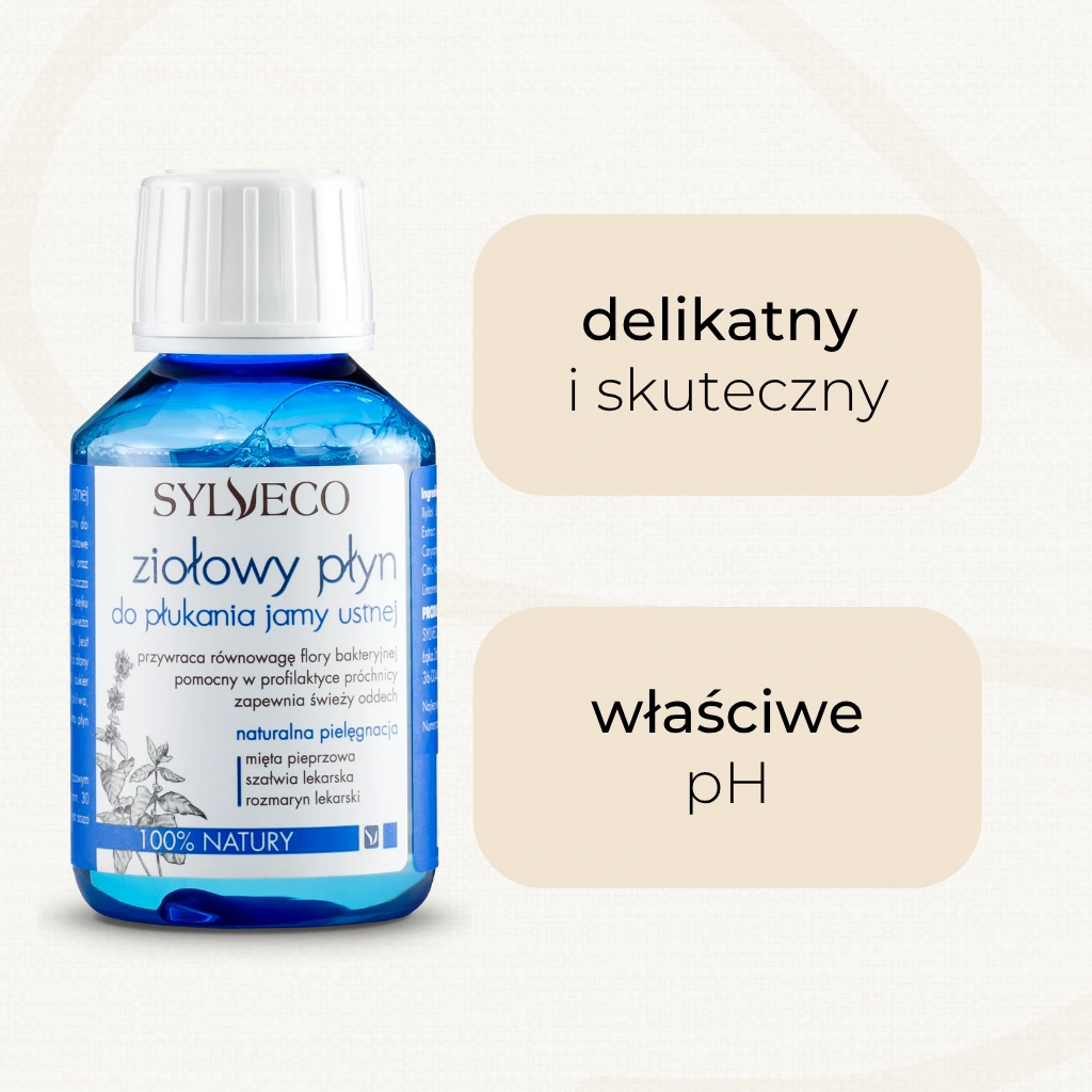 Naturalny, ziołowy płyn do płukania ust. Zawiera odświeżające ekstrakty z szałwii, mięty, rozmarynu, goździków oraz łagodzącą alantoinę. Szybko i skutecznie oczyszcza z resztek pokarmowych, a dzięki zawartości olejku eterycznego z mięty pieprzowej mocno odświeża oddech i zapobiega powstawaniu osadu. Ksylitol (cukier brzozowy) pozwala utrzymać prawidłowe środowisko, wzmacnia szkliwo i przeciwdziała powstawaniu ubytków. Płyn nie zawiera składników drażniących, może być stosowany przez osoby z nadwrażliwością dziąseł i zębów.