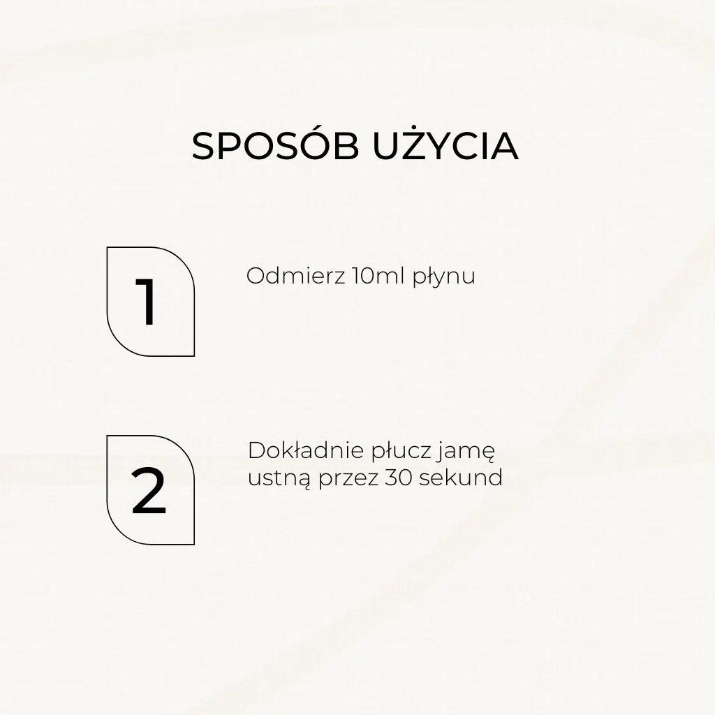 Sposób użycia | Stosować płyn po każdorazowym myciu zębów lub w celu odświeżenia przez min. 30 sekund. Do płukania ust wystarczającą porcją jest doza 10 ml płynu. |