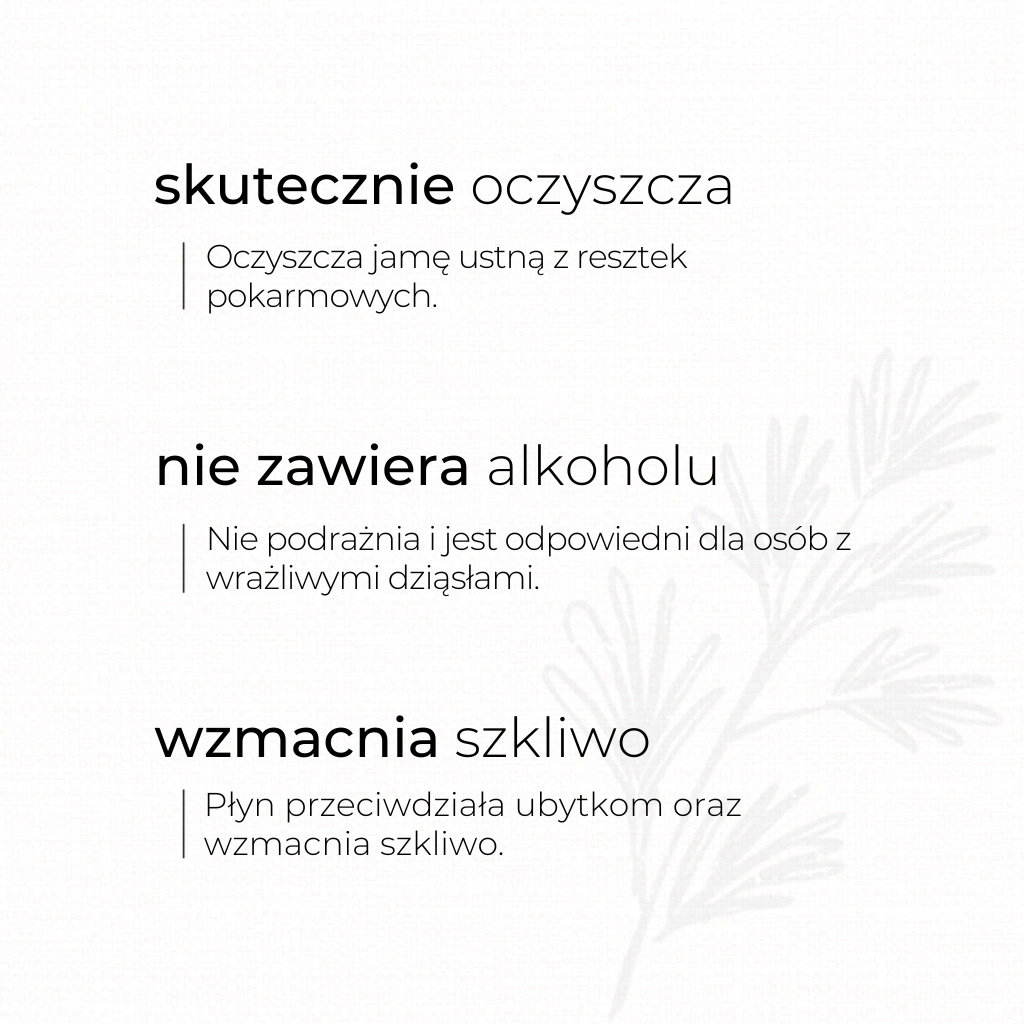 Naturalny, ziołowy płyn do płukania jamy ustnej. Zawiera odświeżające ekstrakty z szałwii, mięty, rozmarynu, goździków oraz łagodzącą alantoinę. Szybko i skutecznie oczyszcza z resztek pokarmowych, a dzięki zawartości olejku eterycznego z mięty pieprzowej mocno odświeża oddech i zapobiega powstawaniu osadu. Ksylitol (cukier brzozowy) pozwala utrzymać prawidłowe środowisko, wzmacnia szkliwo i przeciwdziała powstawaniu ubytków. Płyn nie zawiera składników drażniących, może być stosowany przez osoby z nadwrażliwością dziąseł i zębów.
