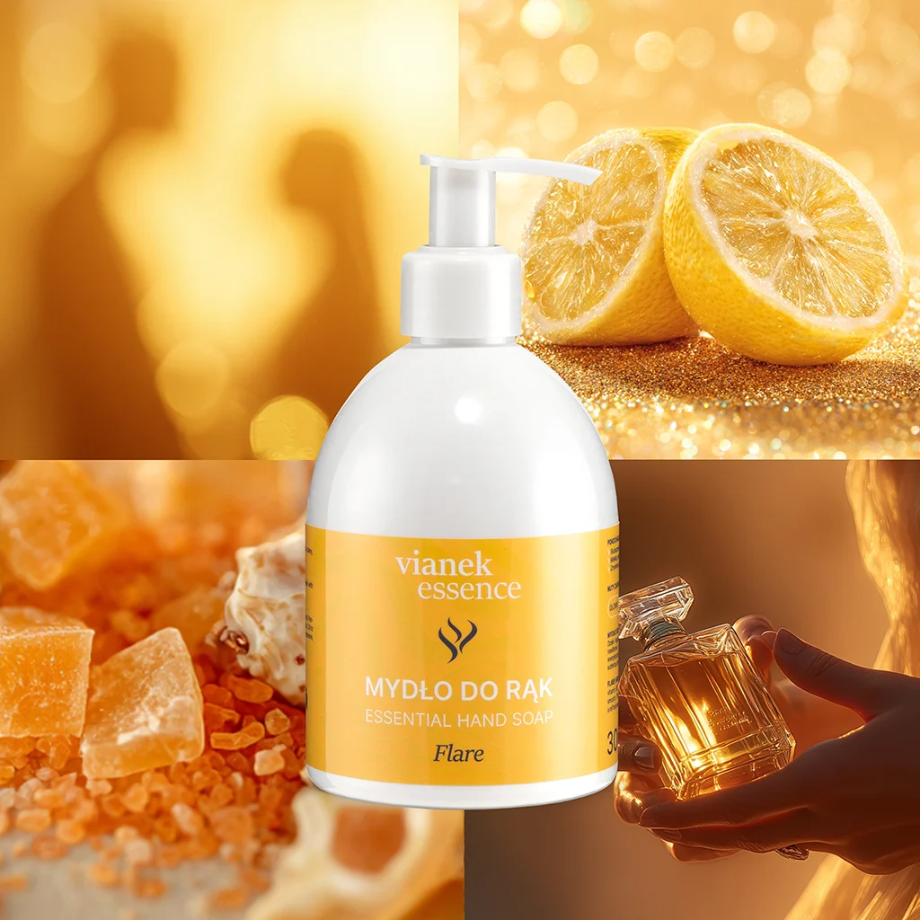Mydło do rąk z serii Flare skutecznie oczyszcza dłonie, nie przesuszając skóry. Dzięki łagodnej formule z pantenolem, alantoiną i kwasem hialuronowym zapewnia nawilżenie, ukojenie i uczucie gładkości już po umyciu. Kompozycja zapachowa łączy energetyzujące cytrusy, świeże nuty ziołowe i ciepłe, pudrowo-drzewne akordy, tworząc subtelną, a jednocześnie wyrazistą aurę wokół każdej pielęgnacyjnej chwili.