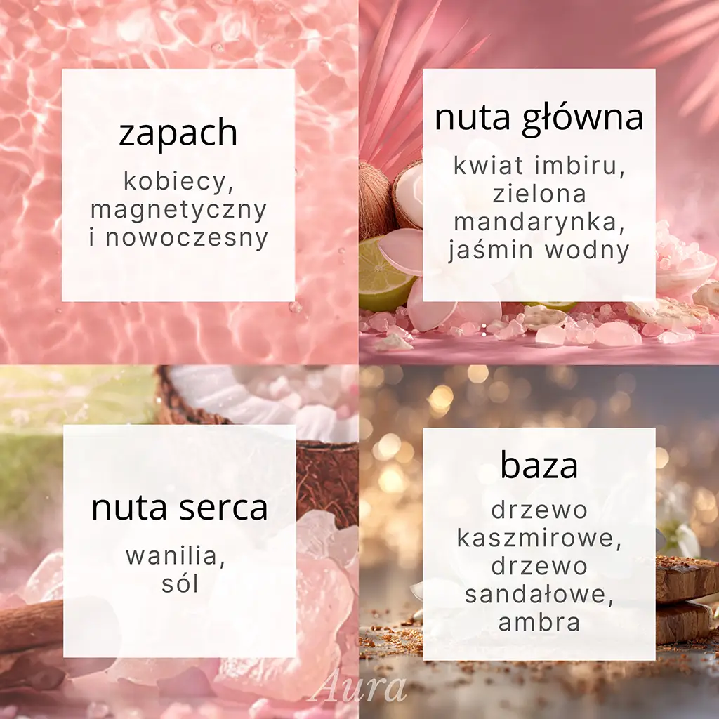Aromat Aura to połączenie świeżości zielonej mandarynki i delikatności kwiatu imbiru, otulone ciepłymi nutami wanilii i drzewa sandałowego. Ta harmonijna kompozycja zapachowa dodaje energii, działa odprężająco i sprawia, że codzienne mycie włosów staje się chwilą relaksu dla zmysłów. Zapach pozostaje subtelnie wyczuwalny na włosach, nadając im uczucie czystości, świeżości i elegancji.