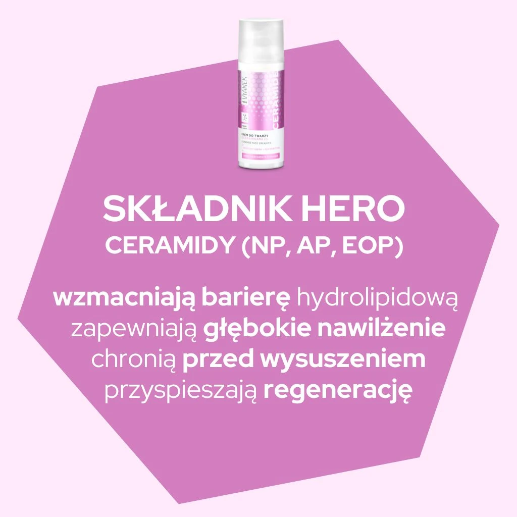 Ceramidy AP, EOP i NP to niezawodni strażnicy Twojej skóry. Działają jak niewidzialna tarcza, która odbudowuje naturalną barierę ochronną. Dzięki nim wilgoć zostaje zatrzymana wewnątrz naskórka, a szkodliwe czynniki zewnętrzne, takie jak smog czy suche powietrze, przestają być zagrożeniem dla Twojej skóry.