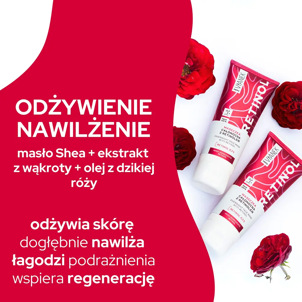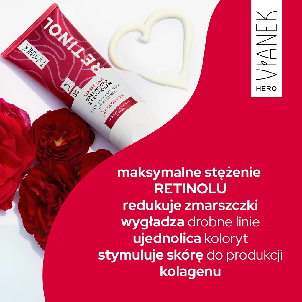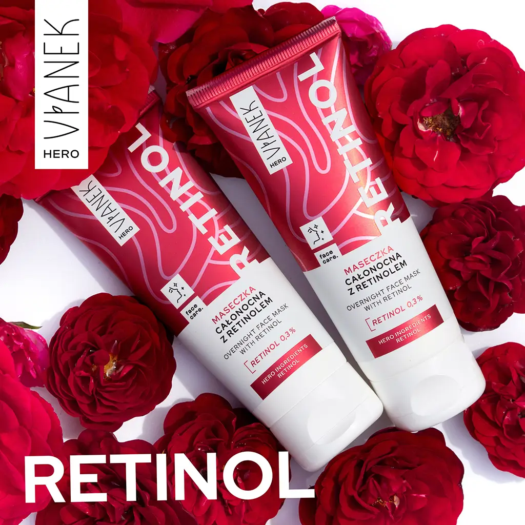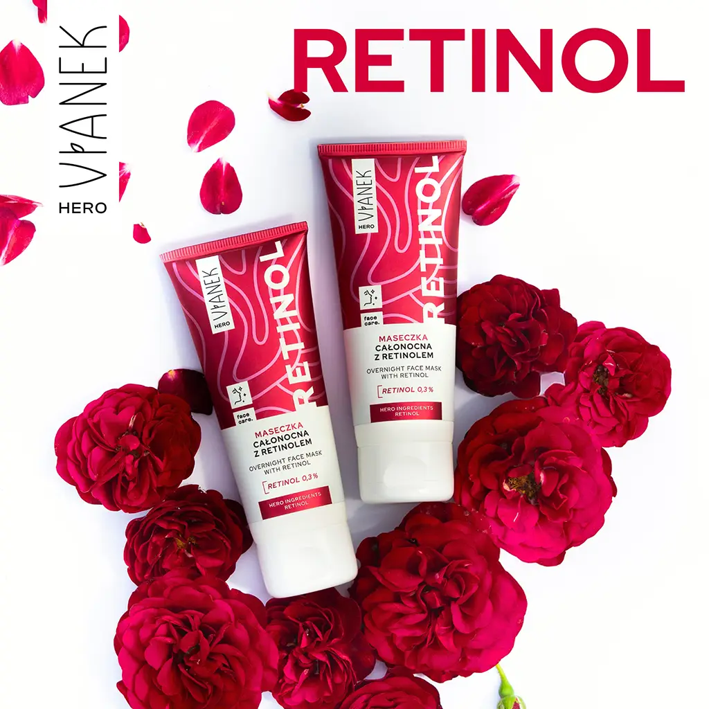 W maksymalnym, zalecanym stężeniu, retinol to prawdziwy superbohater przeciwzmarszczkowej pielęgnacji. Redukuje zmarszczki, wygładza drobne linie, wyrównuje koloryt i pobudza produkcję kolagenu. To właśnie jego siła przywraca Twojej skórze młodszy, świeży wygląd – noc po nocy.