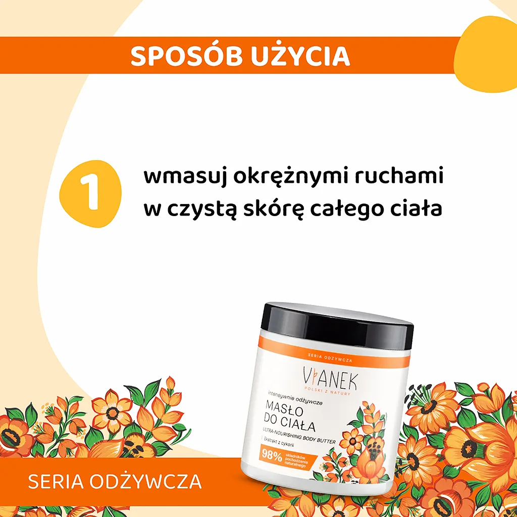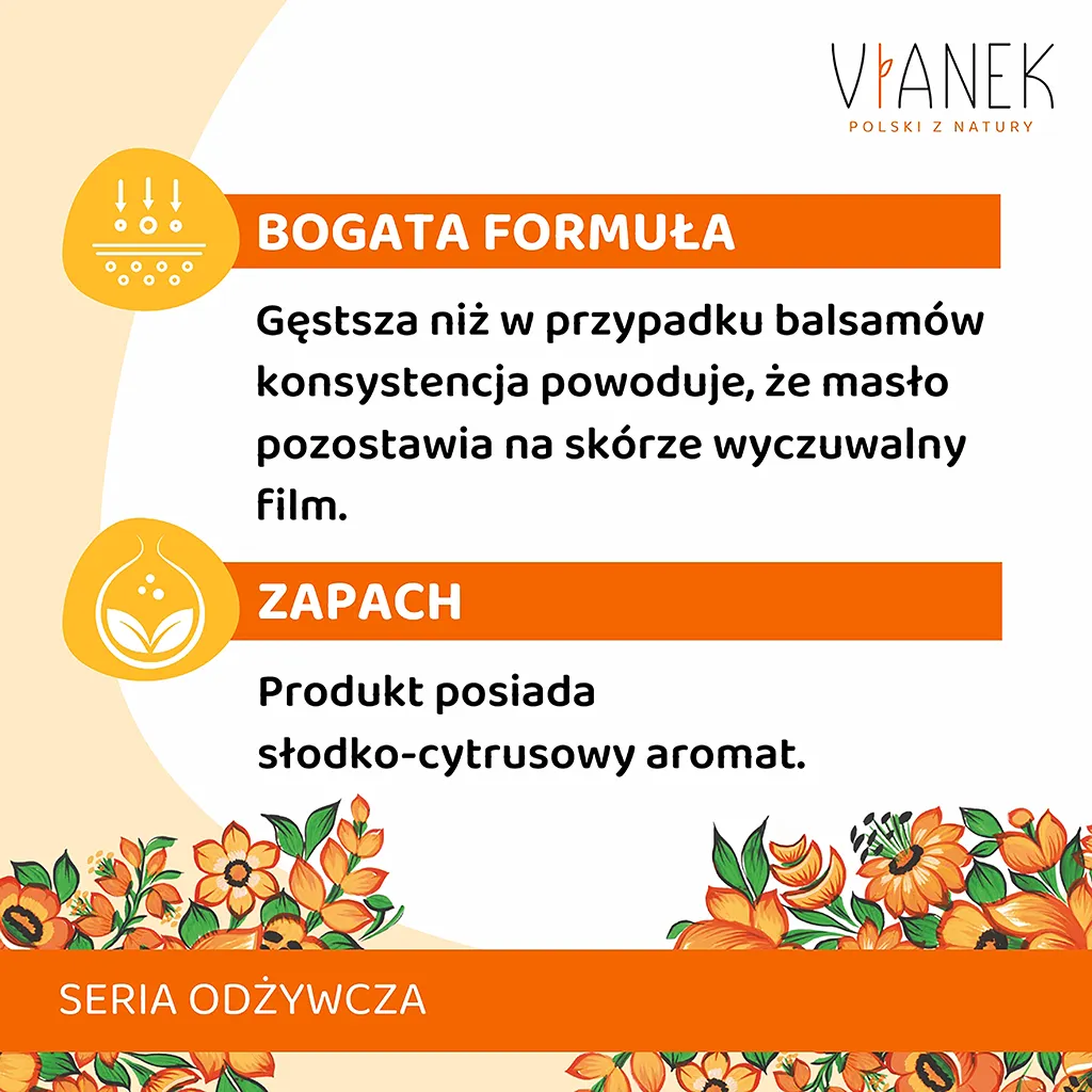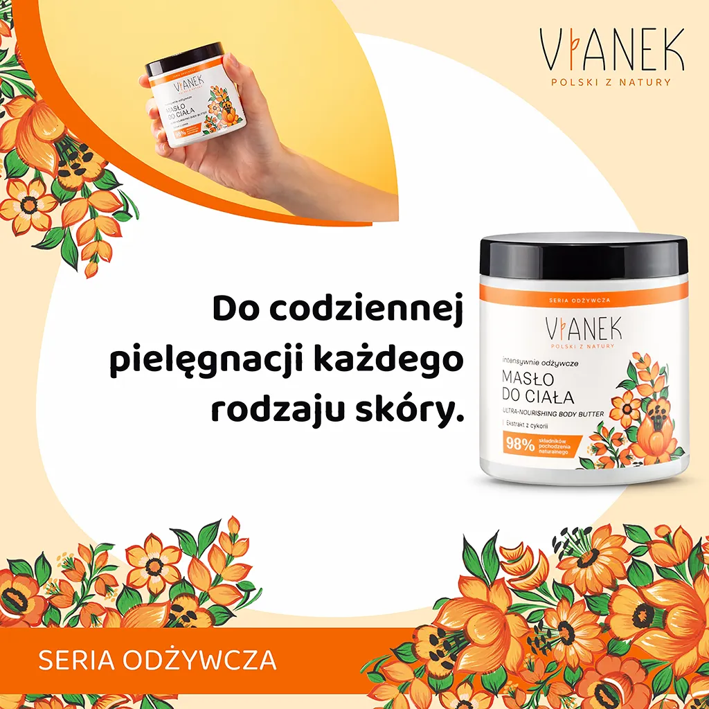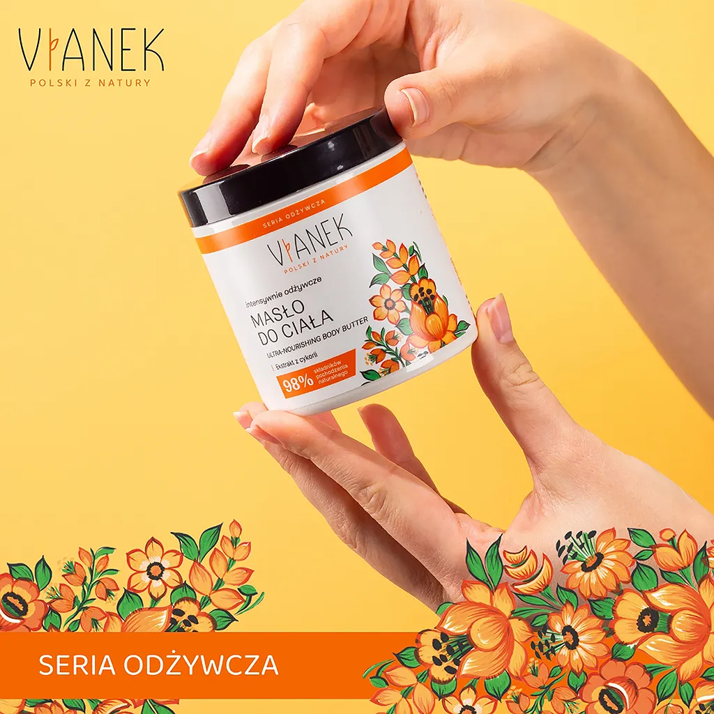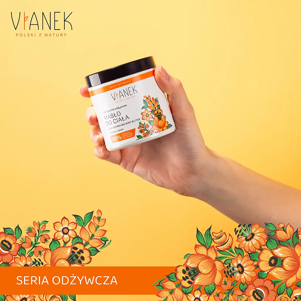 Odkryj wyjątkową pielęgnację z naszym intensywnie odżywczym masłem do ciała VIANEK. Produkt delikatnie otula najlepszymi, naturalnymi składnikami, które odżywią skórę i sprawią, że staje się jedwabiście gładka i promienna. Masło przeznaczone jest do codziennej pielęgnacji każdego typu skóry całego ciała.