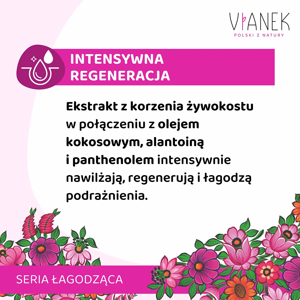 Kremowa emulsja do mycia twarzy, przeznaczona do cery wrażliwej, skłonnej do podrażnień. Delikatnie i skutecznie usuwa zanieczyszczenia, nie naruszając jednocześnie bariery lipidowej skóry. Zawiera kompleks składników łagodzących (alantoina, panthenol) i powlekających, w tym ekstrakt z korzenia żywokostu o silnych właściwościach regenerujących. Dodatek oleju kokosowego nawilża i odżywia, zwiększając elastyczność skóry. Emulsja po umyciu twarzy pozostawia przyjemne uczucie czystości, miękkości i gładkości.