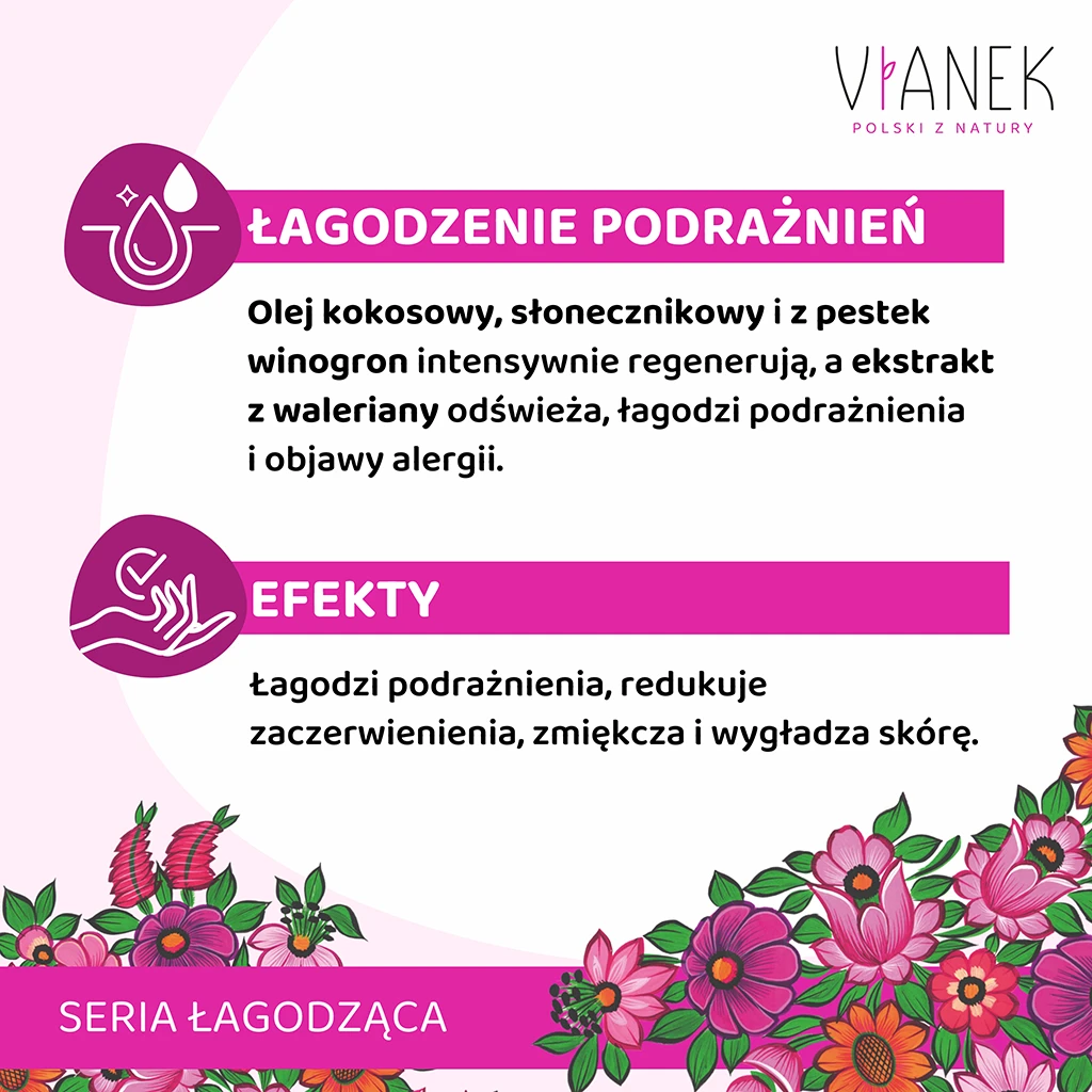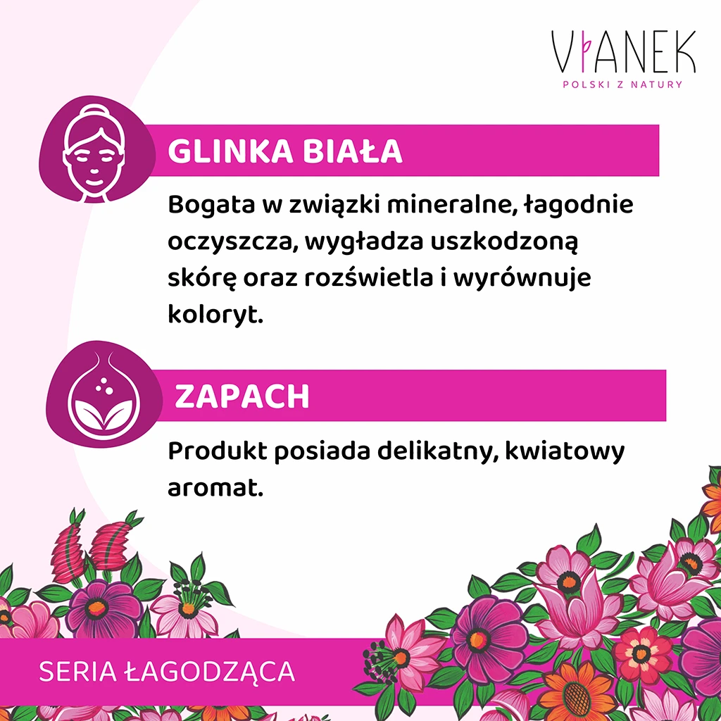Łagodząca maseczka do twarzy VIANEK zachęca nie tylko swoimi właściwościami pielęgnacyjnymi, ale również delikatnym, kwiatowym aromatem. Stosowanie jej staje się prawdziwą chwilą przyjemności dla ciała i ducha, pozwalając na chwilę oddechu w codziennym zabieganiu.