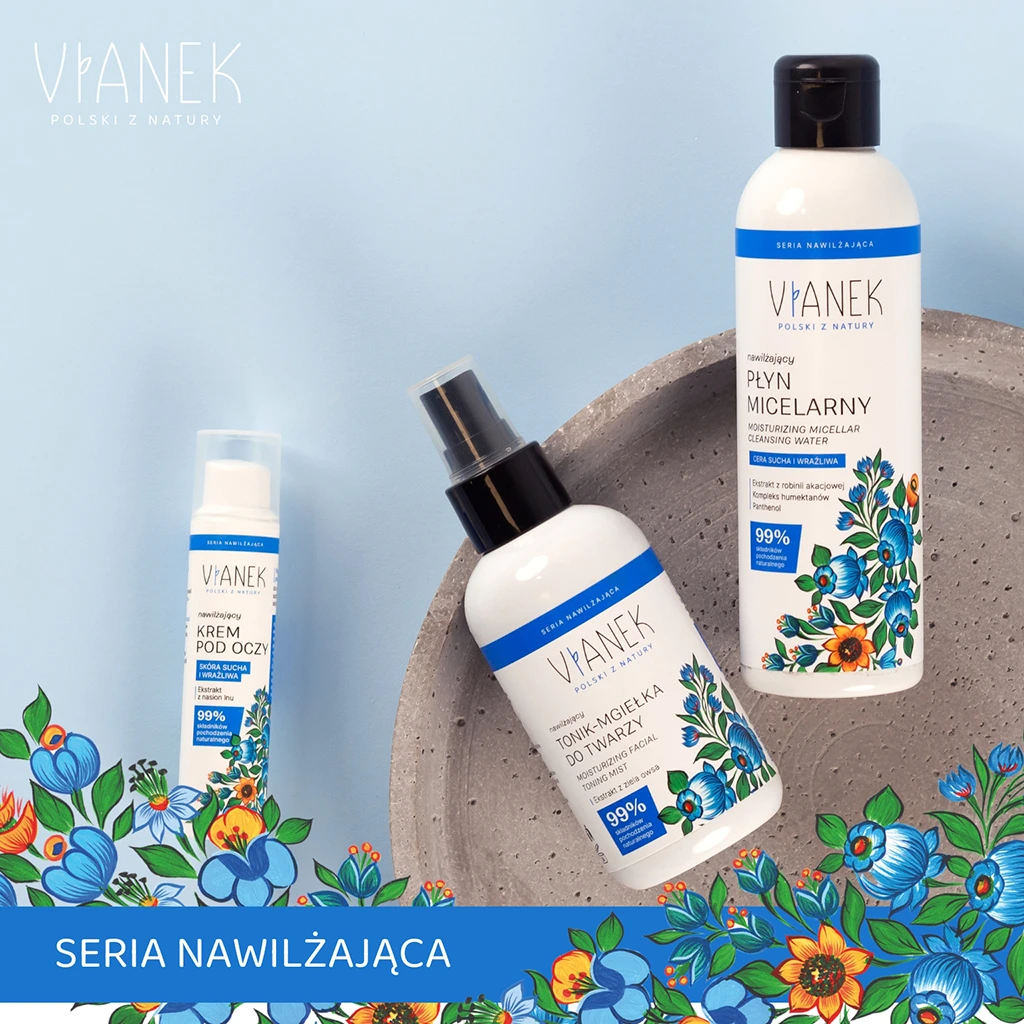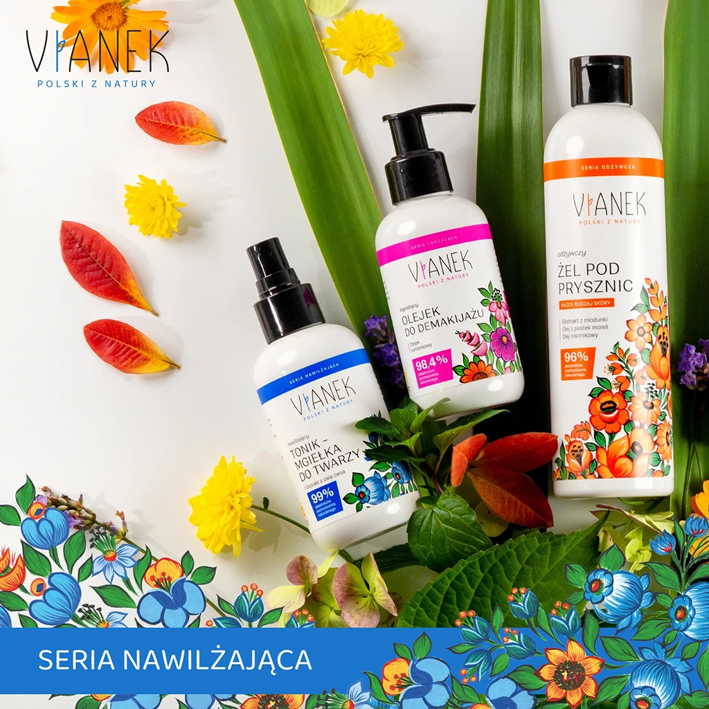 Nawilżający tonik-mgiełka do twarzy VIANEK zawiera olej z kiełków pszenicy, ekstrakt z ziela owsa i pantenol. Składniki te są znane z właściwości łagodzących i kojących. Pomagają zminimalizować podrażnienia i przywrócić skórze równowagę. Olej z kiełków pszenicy i ekstrakt z owsa są bogate w antyoksydanty, które pomagają w walce z wolnymi rodnikami, chroniąc skórę przed szkodliwym wpływem czynników zewnętrznych. Pantenol jest znanym składnikiem łagodzącym, który pomaga zredukować zaczerwienienia i uczucie suchości.