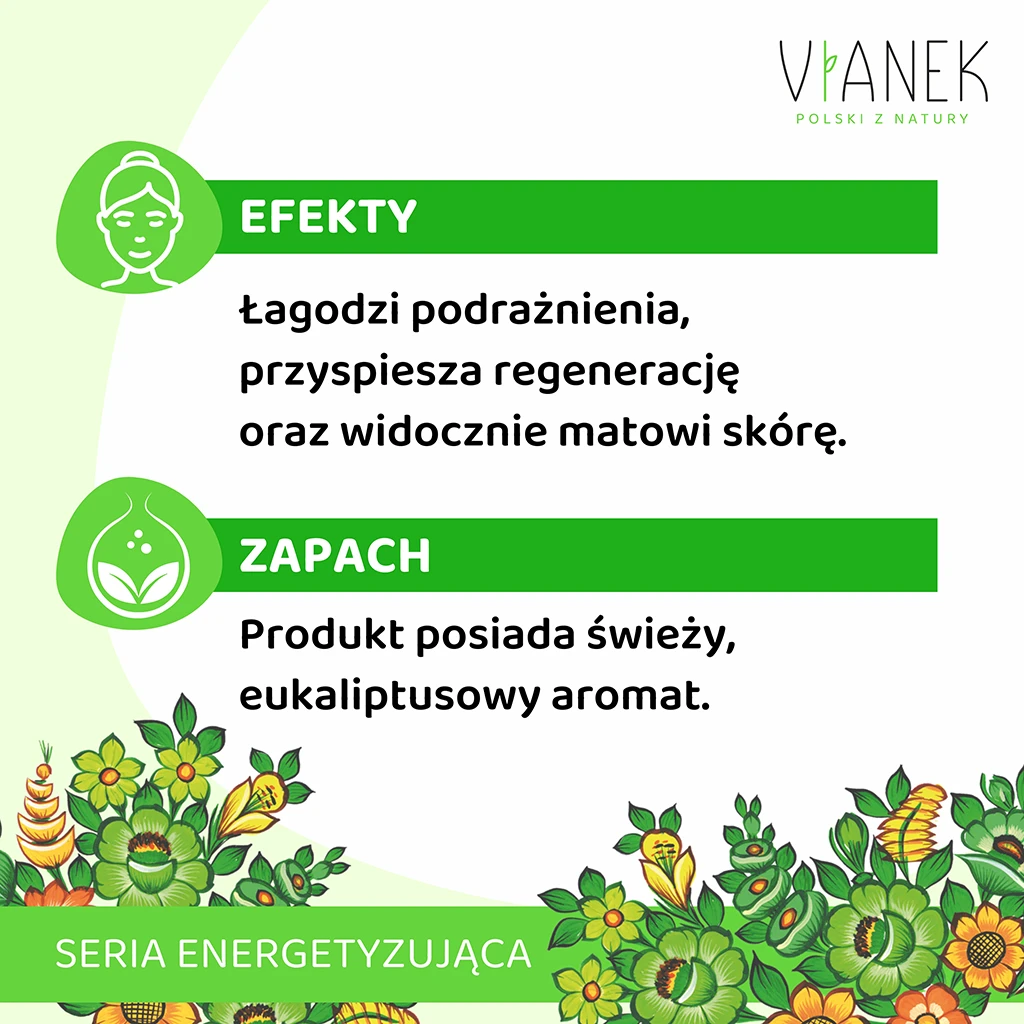 | Działanie | Matowi skórę, Normalizuje pracę gruczołów łojowych, Oczyszcza cerę, Pomaga w walce z niedoskonałościami, Przyspiesza regenerację |
