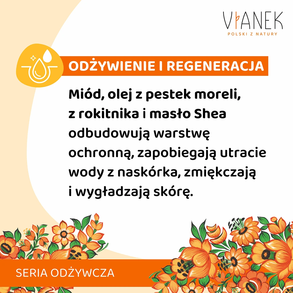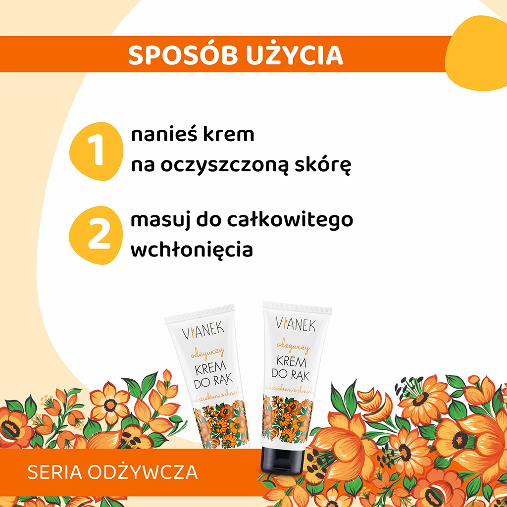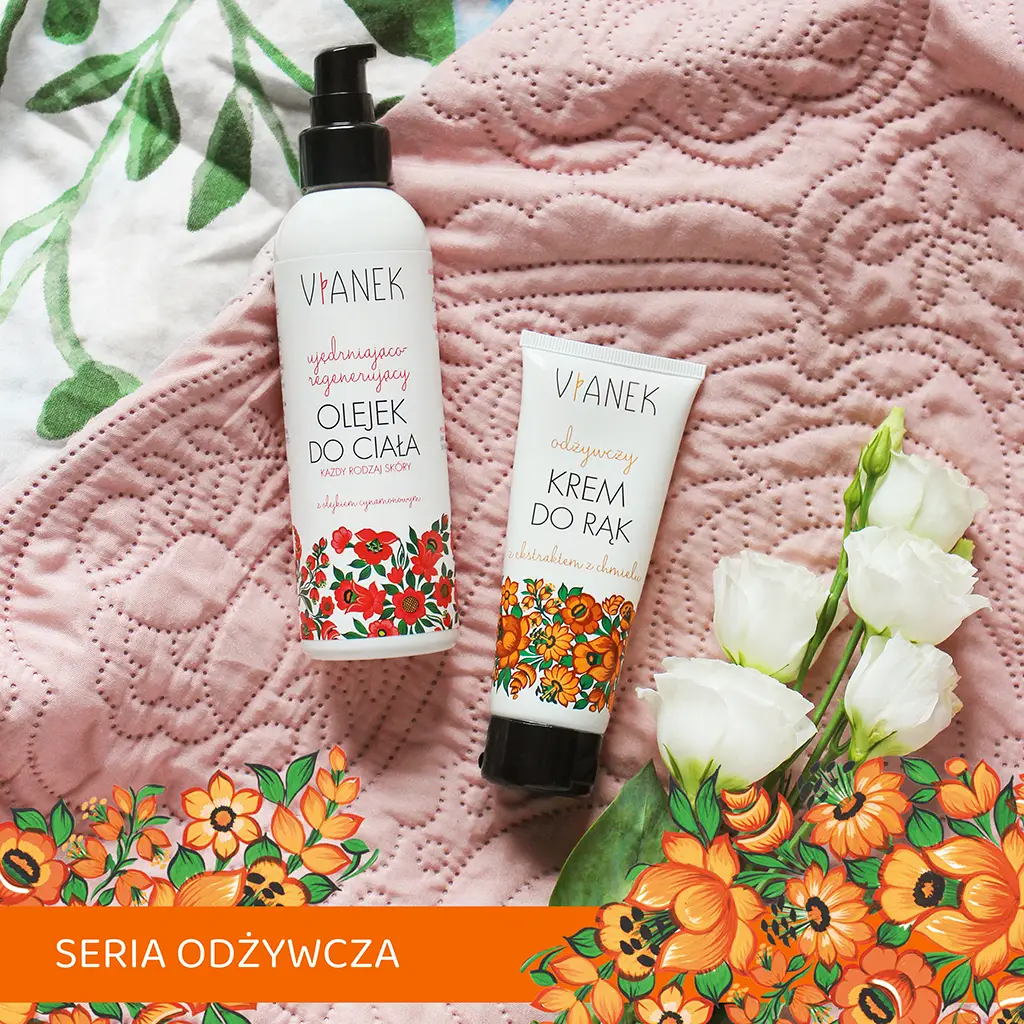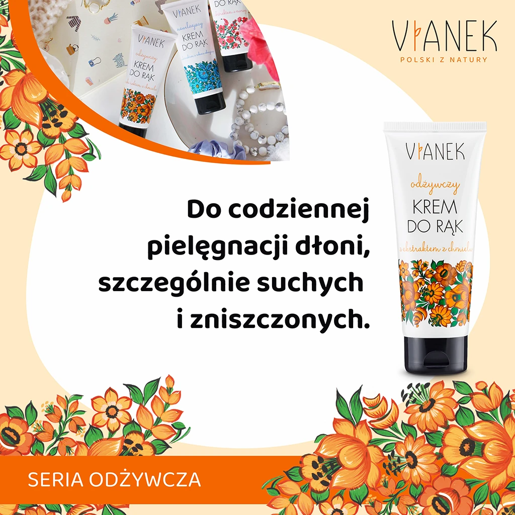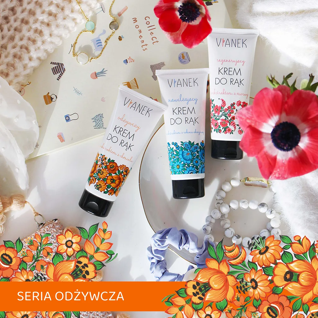 Przygotuj się na wyjątkowy rytuał pielęgnacji z naszym Odżywczym kremem do rąk VIANEK. Twoje dłonie odzwierciedlają Twoją troskę o siebie, dlatego warto zaopiekować się nimi przy użyciu najwyższej jakości produktów. Nasz krem powstał z naturalnych składników, z myślą o pielęgnacji suchych, szorstkich, popękanych dłoni.