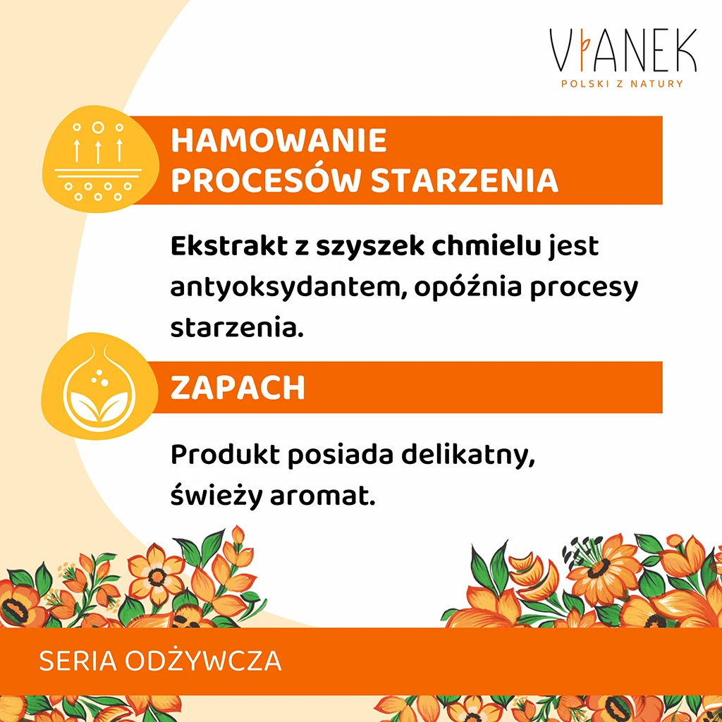 Ale to nie wszystko! Nasz krem do rąk nie tylko odżywia skórę, ale także opóźnia procesy starzenia. Dzięki ekstraktowi z szyszek chmielu, który jest silnym antyoksydantem, możesz zatrzymać piękny, młody wygląd skóry dłoni na dłużej.