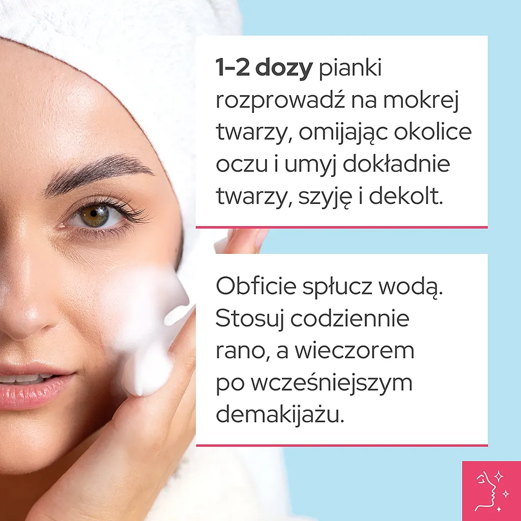 | Sposób użycia | 1-2 dozy pianki rozprowadź na mokrej twarzy, omijając okolice oczu i umyj dokładnie twarzy, szyję i dekolt. Obficie spłucz wodą. Stosuj codziennie rano, a wieczorem po wcześniejszym demakijażu. |